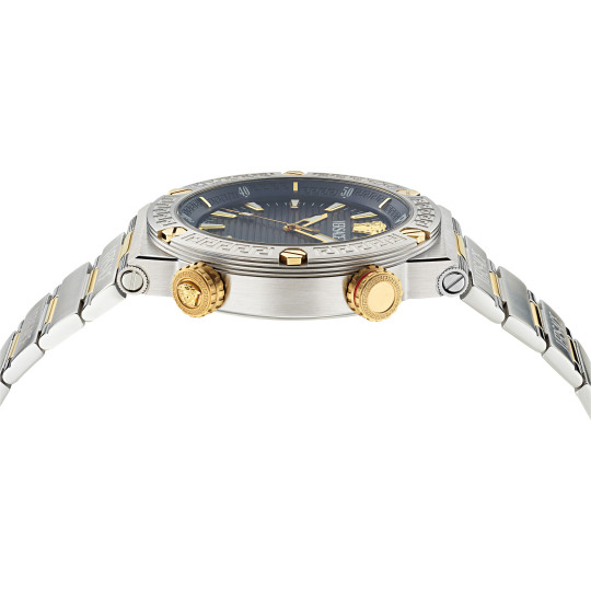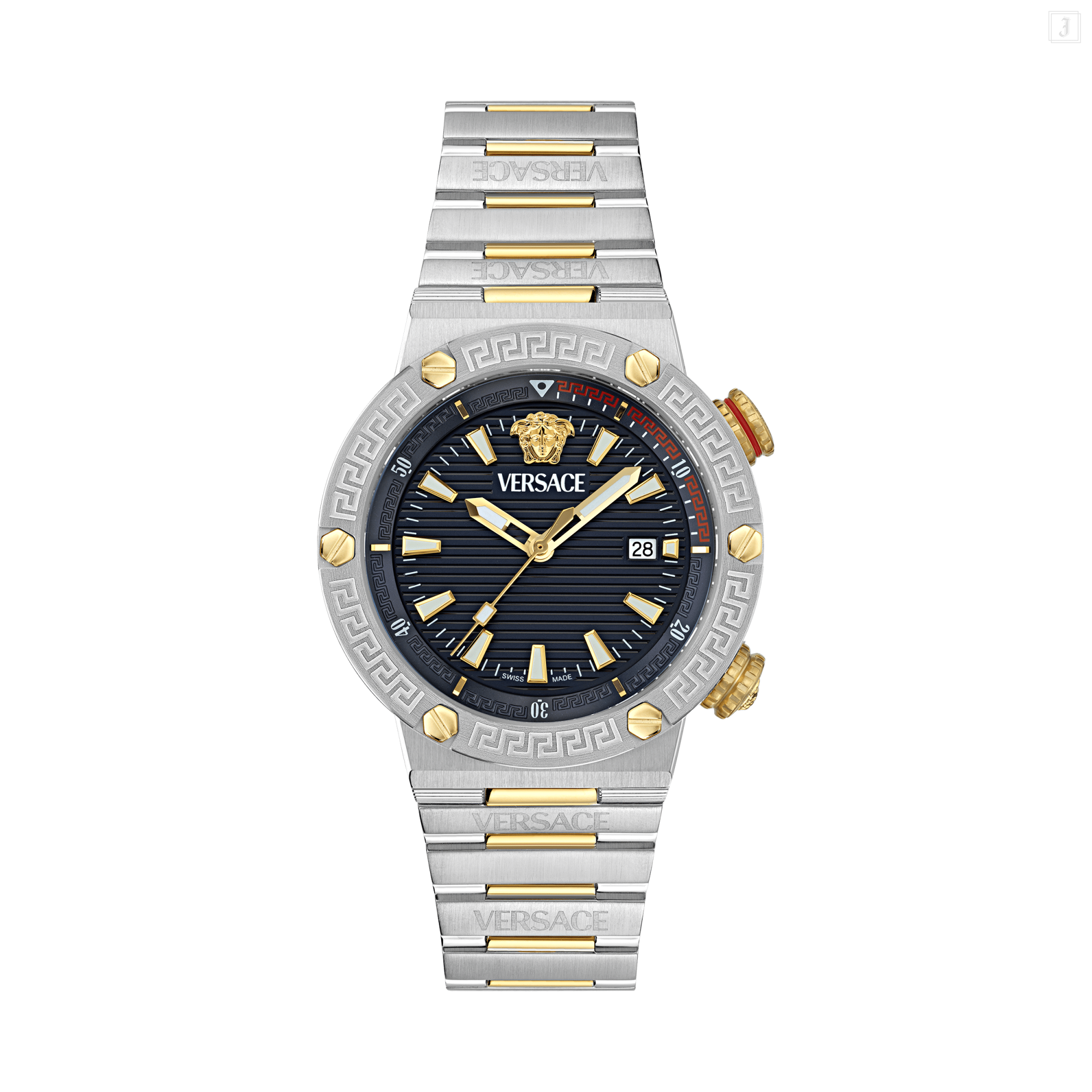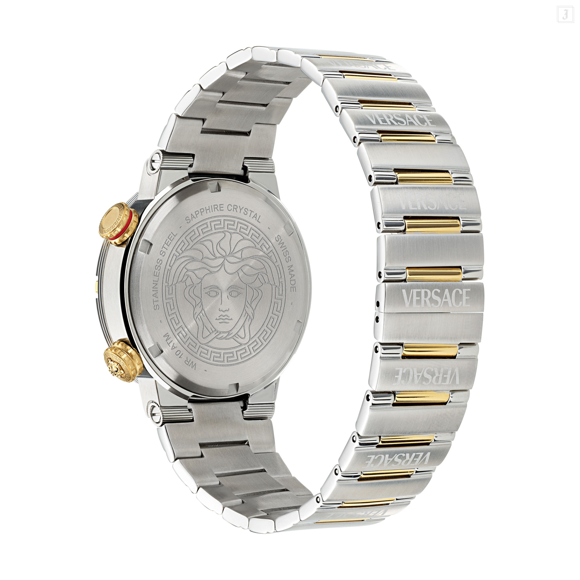 A luxurious, sporty timepiece combining geometric shapes and iconic brand details. The top ring is marked by a Greca motif and the dial features the Versace logo at 6 o'clock and a Medusa at 12 o'clock. The design is complete with a colourful accent. All Versace watches are guaranteed by the 'Swiss Made' marking.