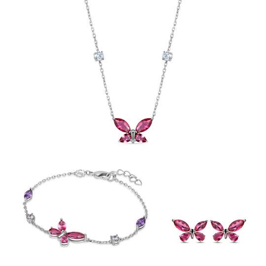 An expression of delicate joy, Saint Honoré’s Gala set showcases a graceful butterfly crafted from soft pink crystals. The design is balanced with two crystal accents on either side, adding subtle brilliance and symmetry. Feminine and refined, it’s a modern classic that brings charm to every occasion. |