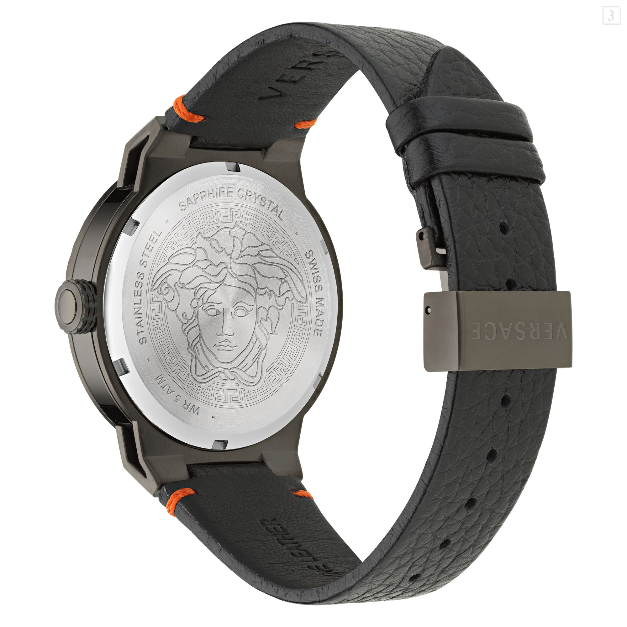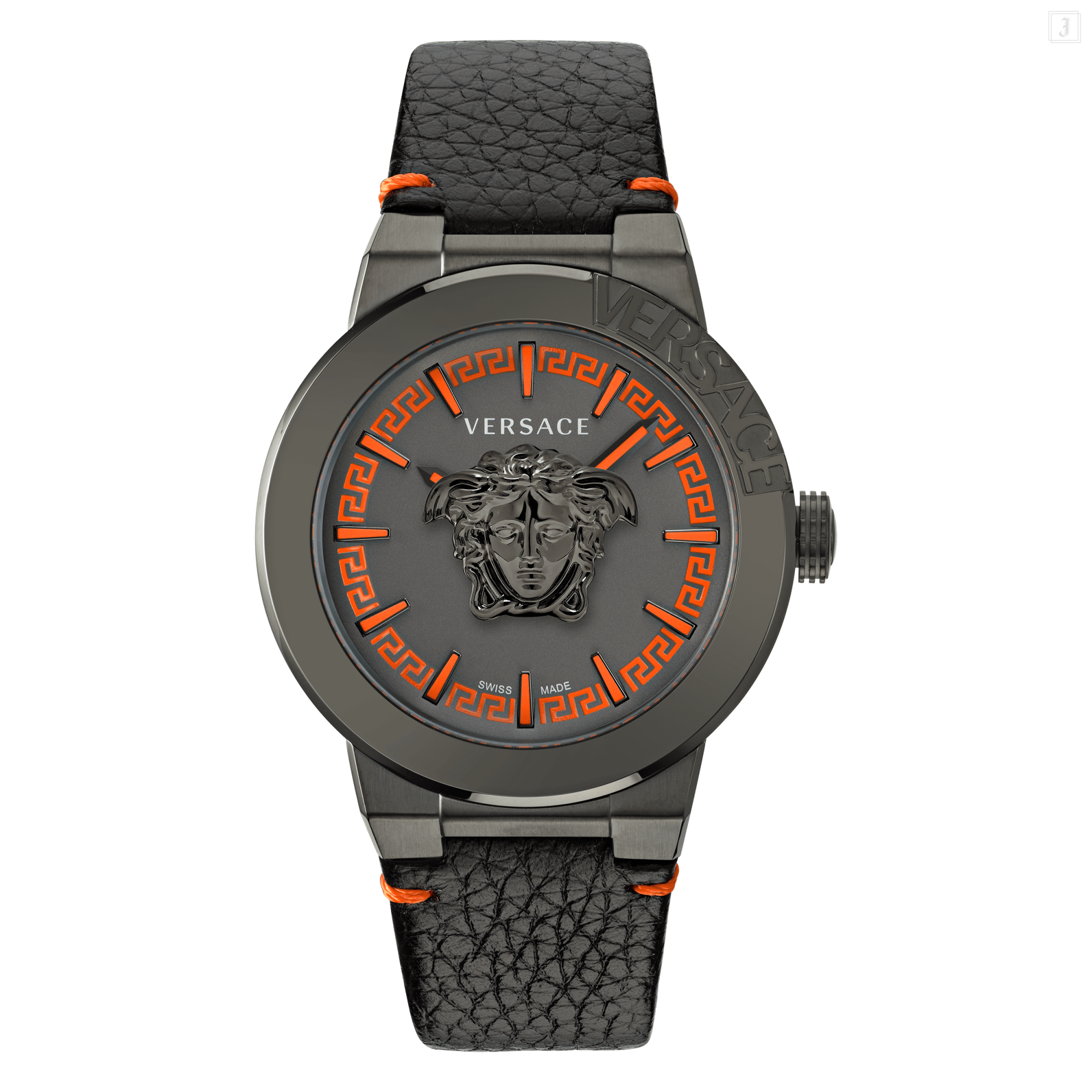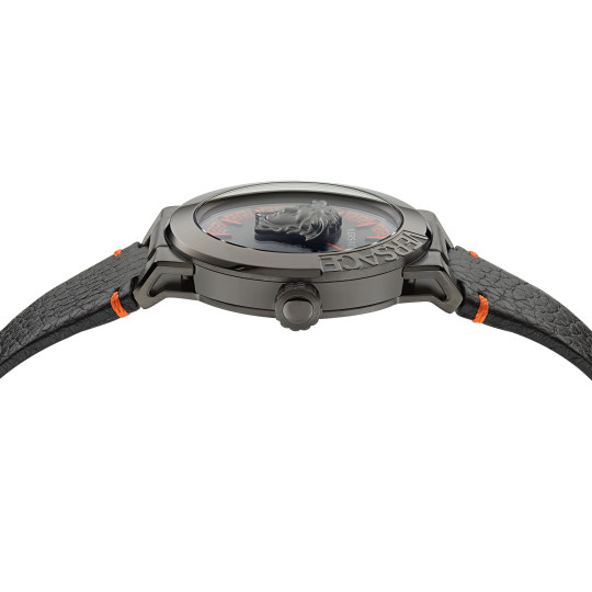 This masculine timepiece features a three-dimensional floating Medusa set between two crystals with a two-hands movement system. |