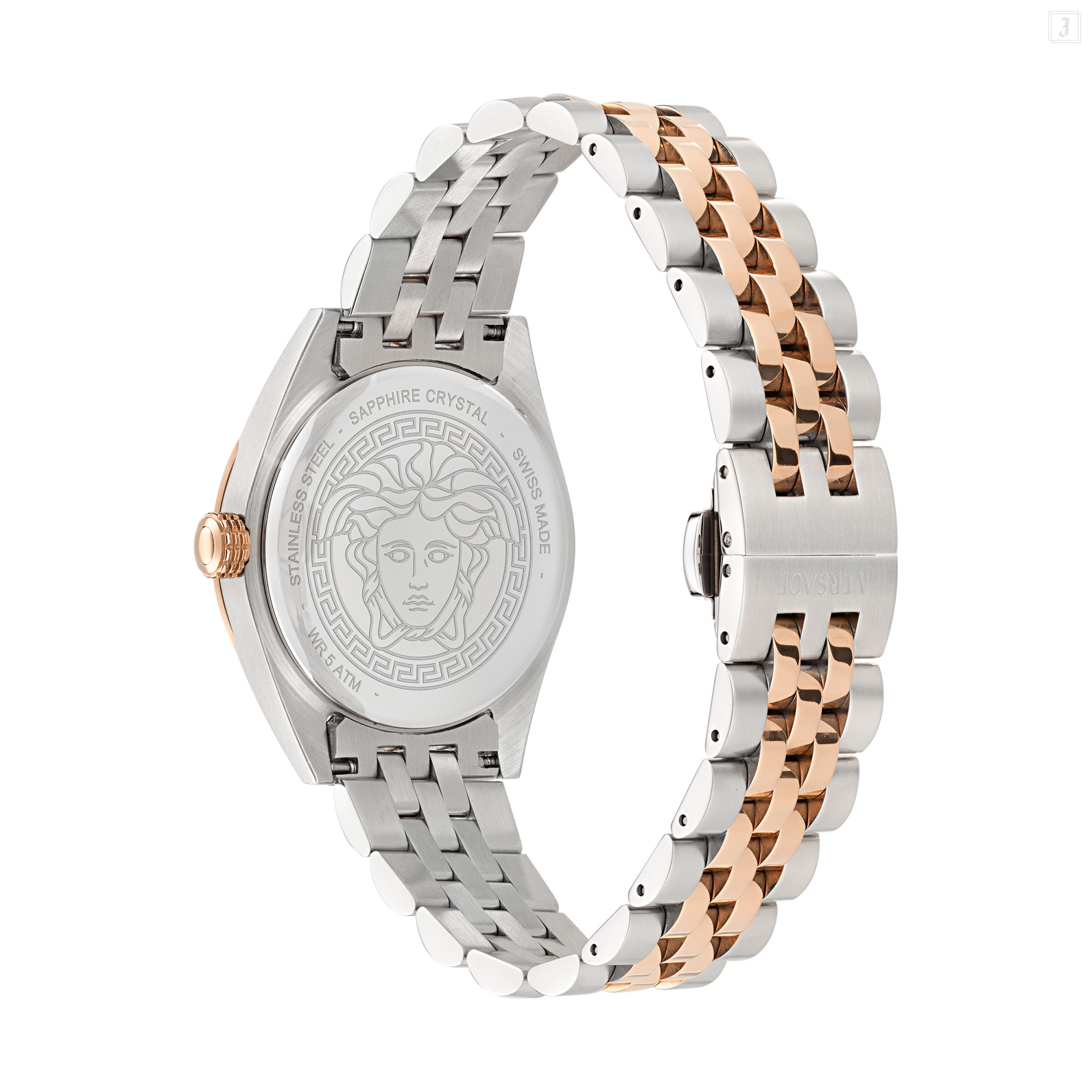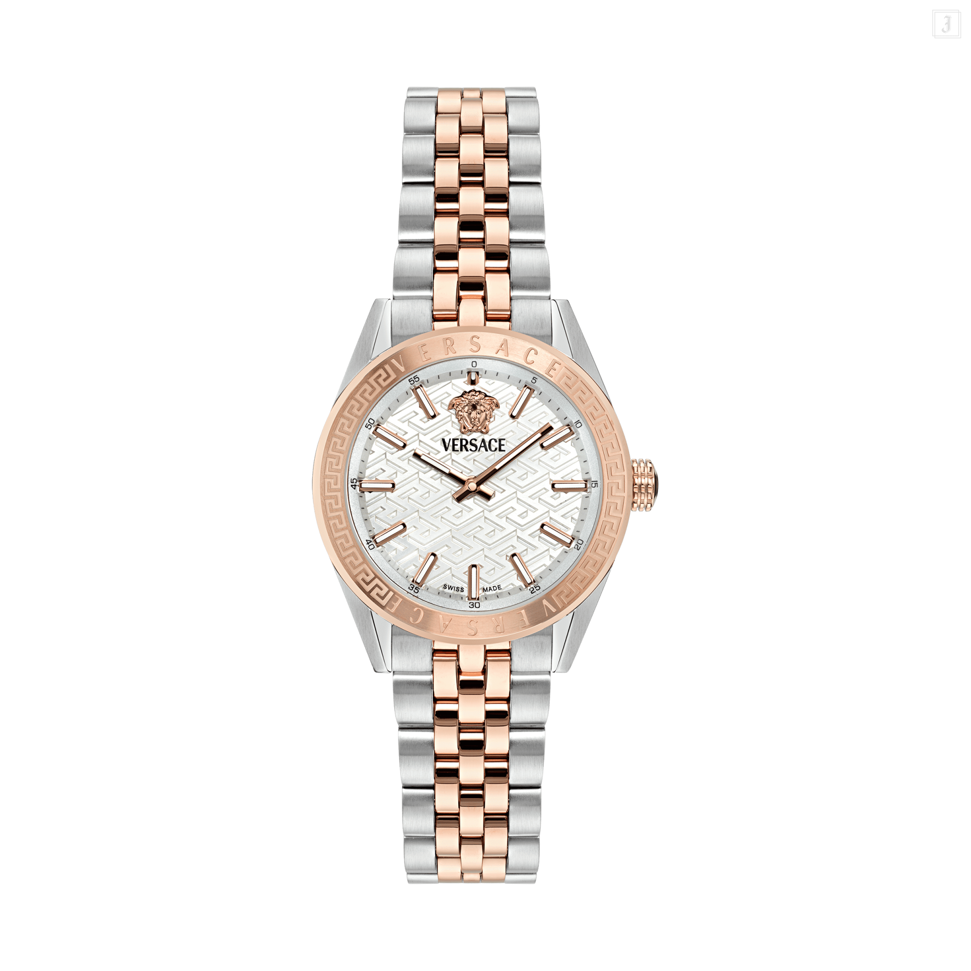 An iconic timepiece featuring an innovative design characterised by a dome-shaped glass and a bold top ring with Versace lettering. The dial has an all-over logo pattern and a three-dimensional Medusa accent at 12 o'clock. The case is enriched with 3-hands movement, a date window at 3 o'clock and the tachymeter on the top ring. All Versace watches are guaranteed by the 'Swiss Made' marking. |