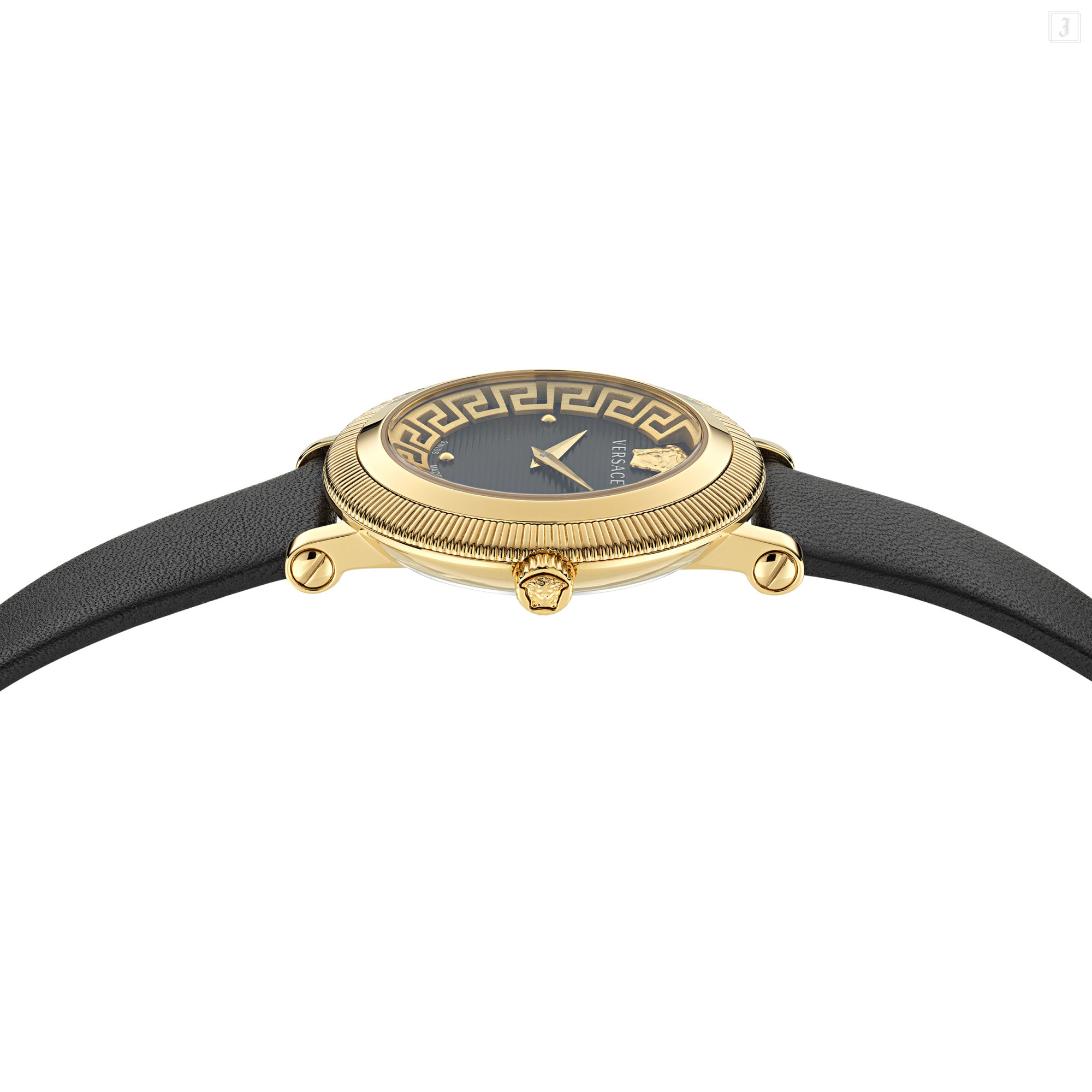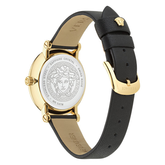 An elegant case with signature Versace codes including a small three-dimensional Medusa at 12 o'clock and a lug Greca pattern on the inner dial. The timepiece is complete with a metal bracelet with horizontal textured links. All Versace watches are guaranteed by the 'Swiss Made' marking.