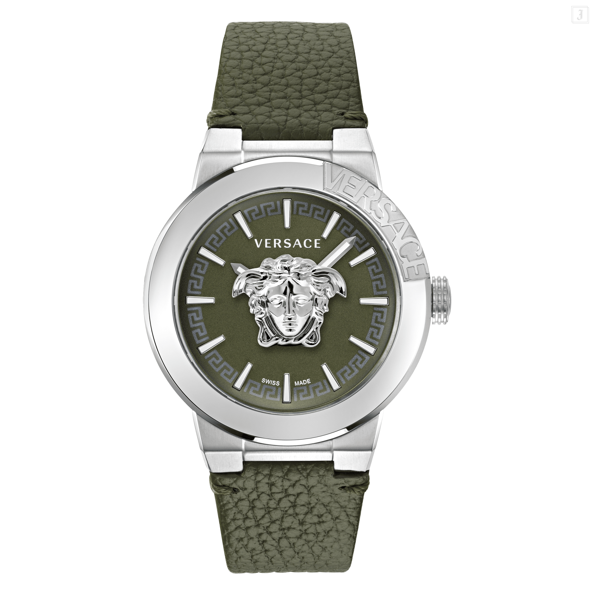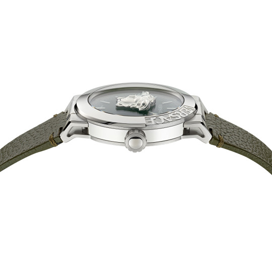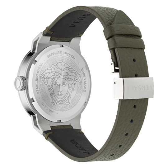 This masculine timepiece features a three-dimensional floating Medusa set between two crystals with a two-hands movement system. |
