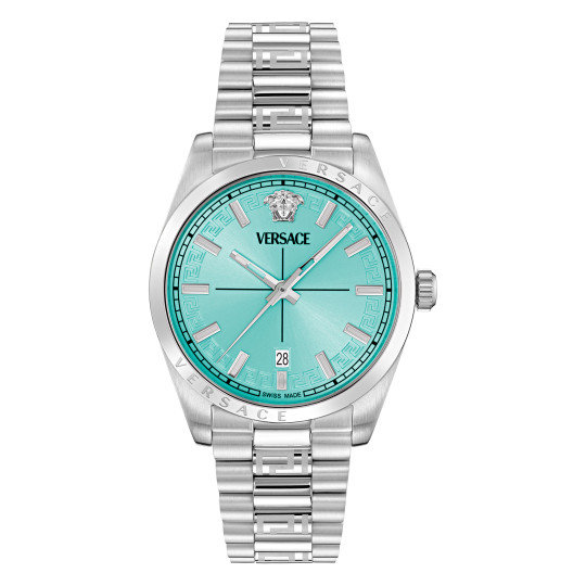 The Versace Millenyium Gent watch features a case with the House's Medusa and Versace Logo at 12 o'clock and a Greca motif on the inner dial. |