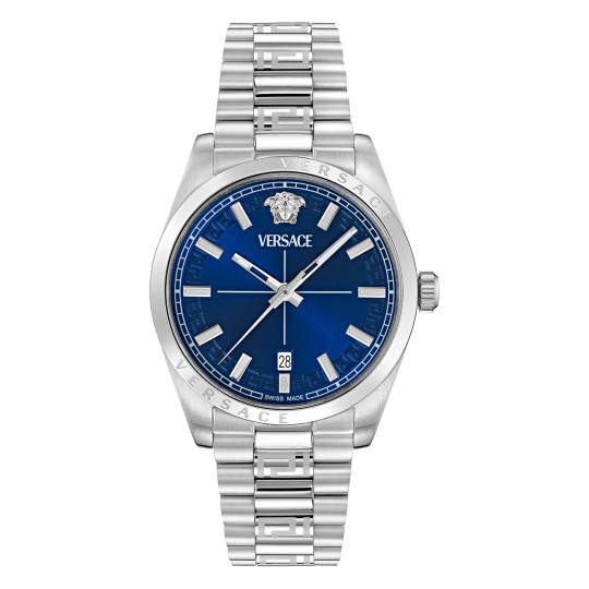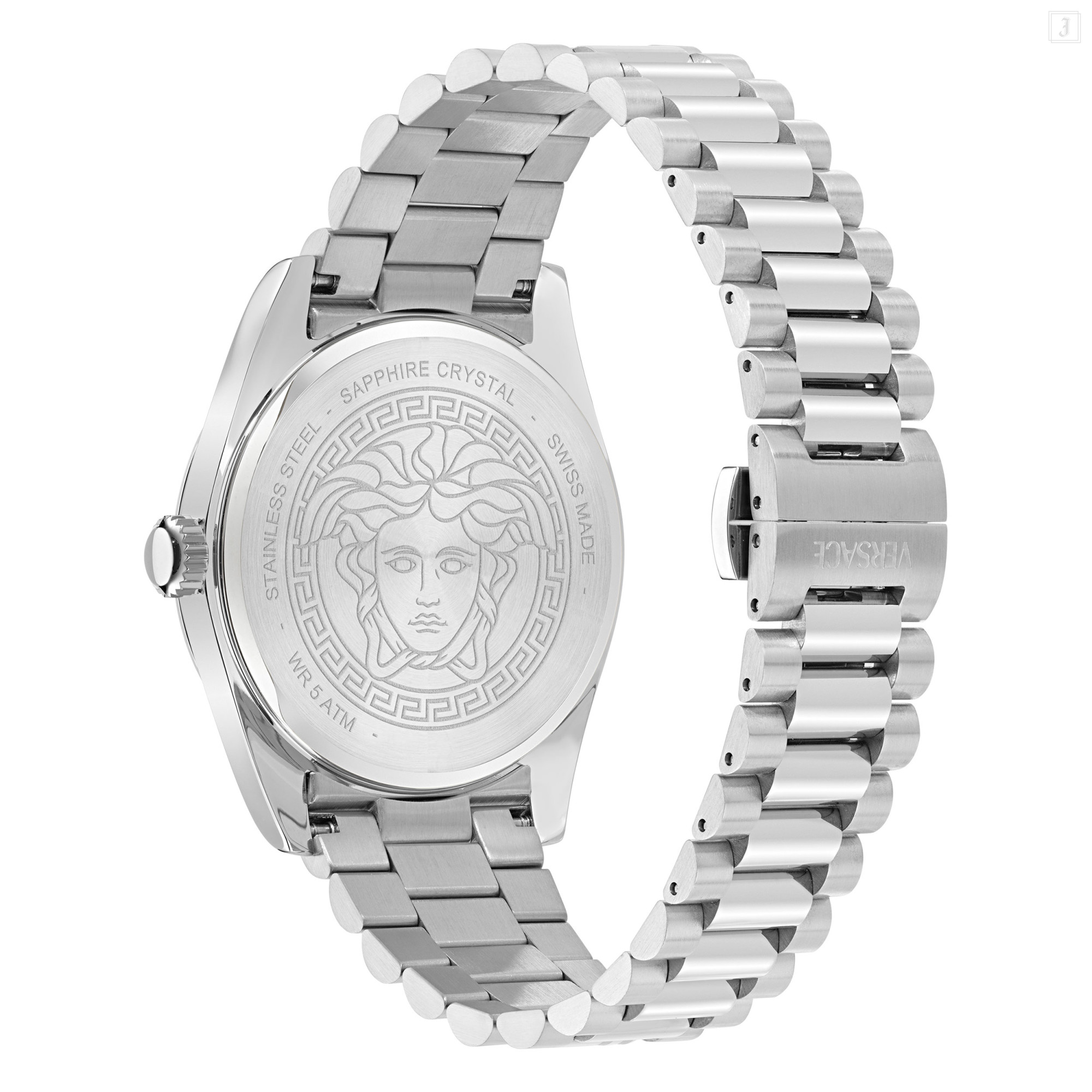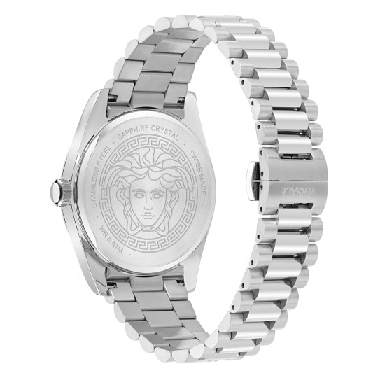 The Versace Millenyium Gent watch features a case with the House's Medusa and Versace Logo at 12 o'clock and a Greca motif on the inner dial. |