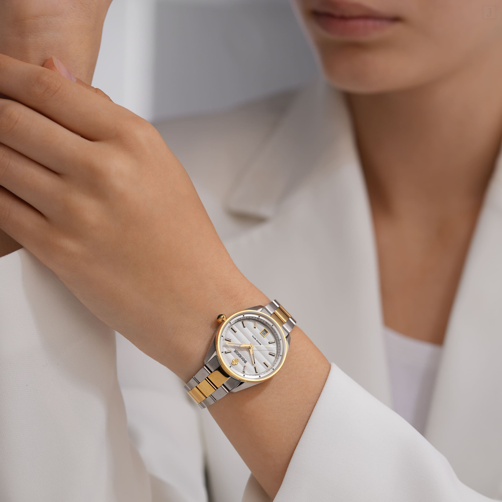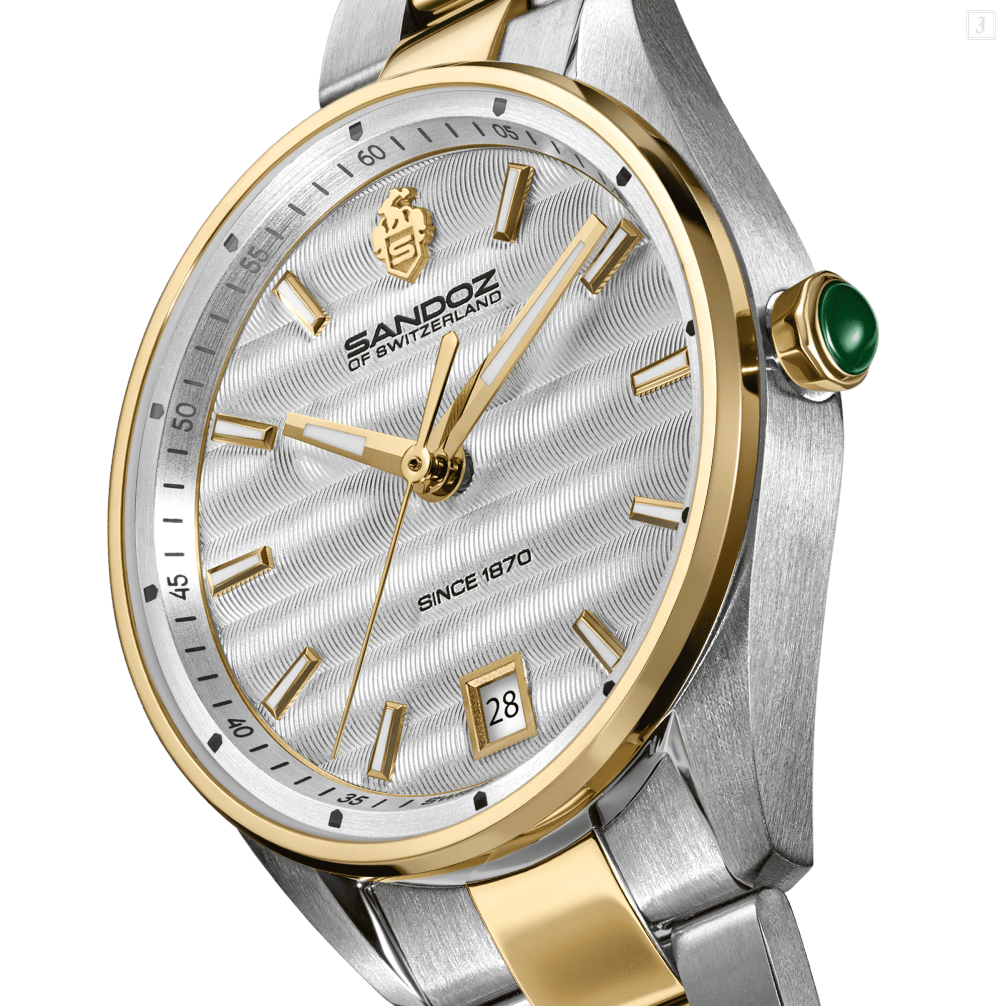 Combining present-day practicality with the revered traditions of horology, Bachelin is at once contemporary and elegant. The silver dial, detailed with subtle Côtes de Genève striping, holds its own beneath a flat sapphire crystal. The yellow gold hands and markers know when to glow. A cabochon crown completes the look, refined and elegant. A date window nestles at six o’clock, mirroring the tone of the watch’s palette.