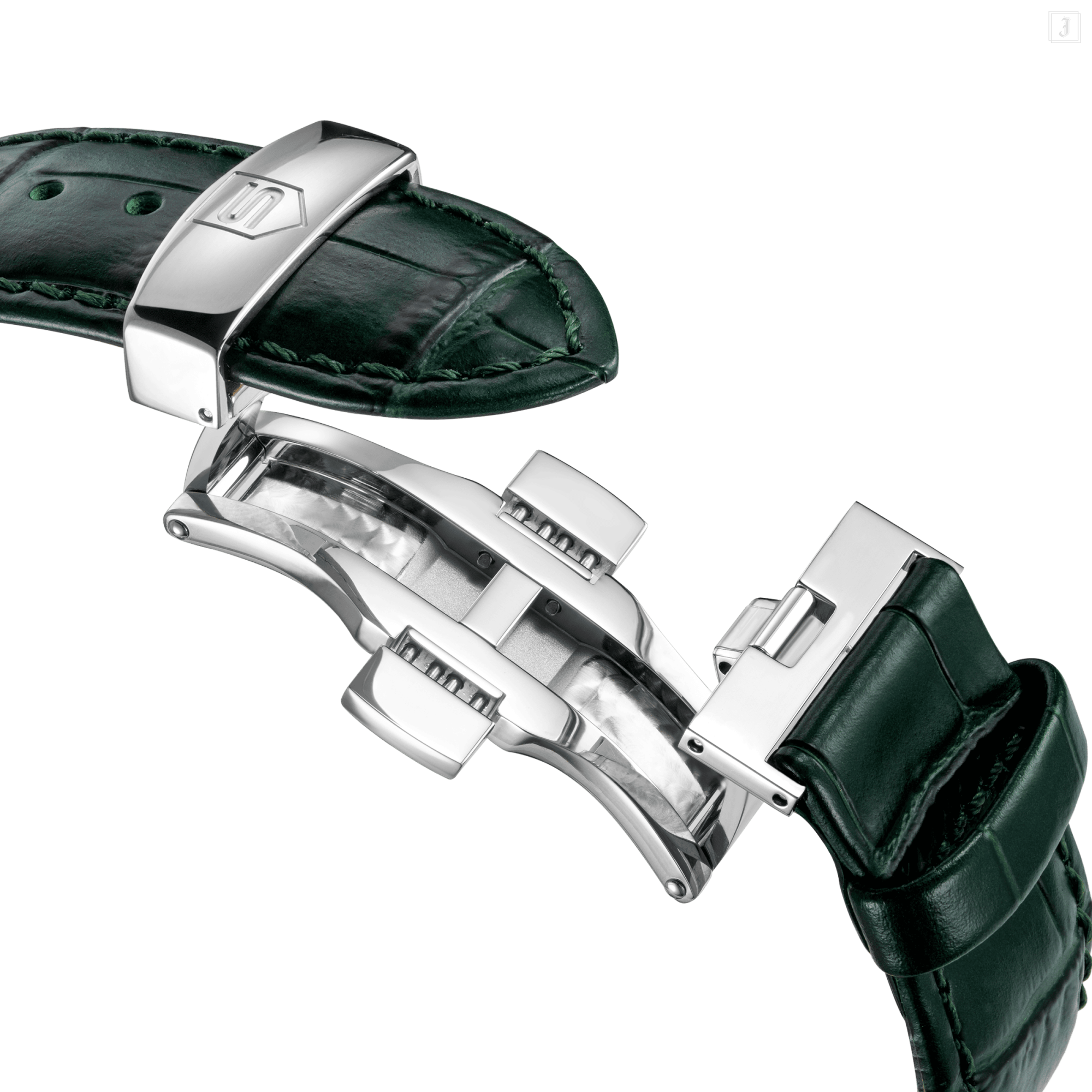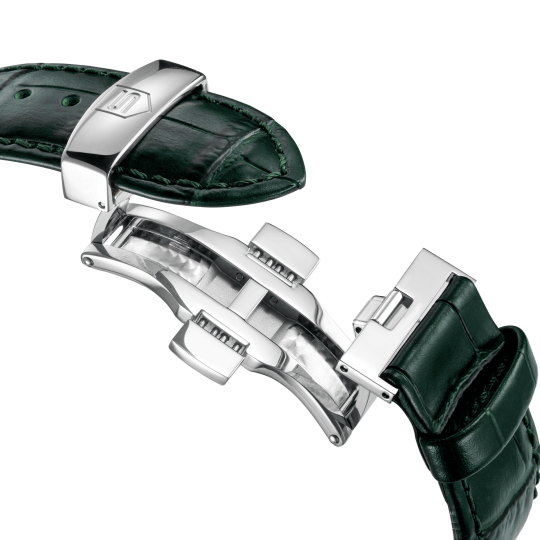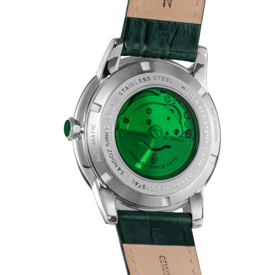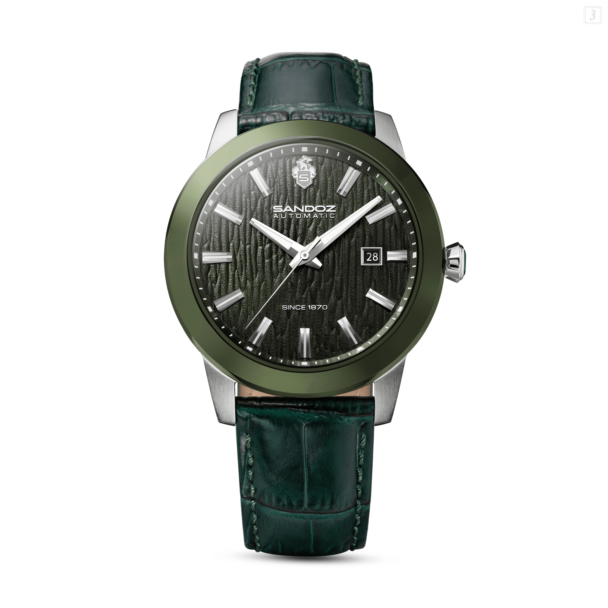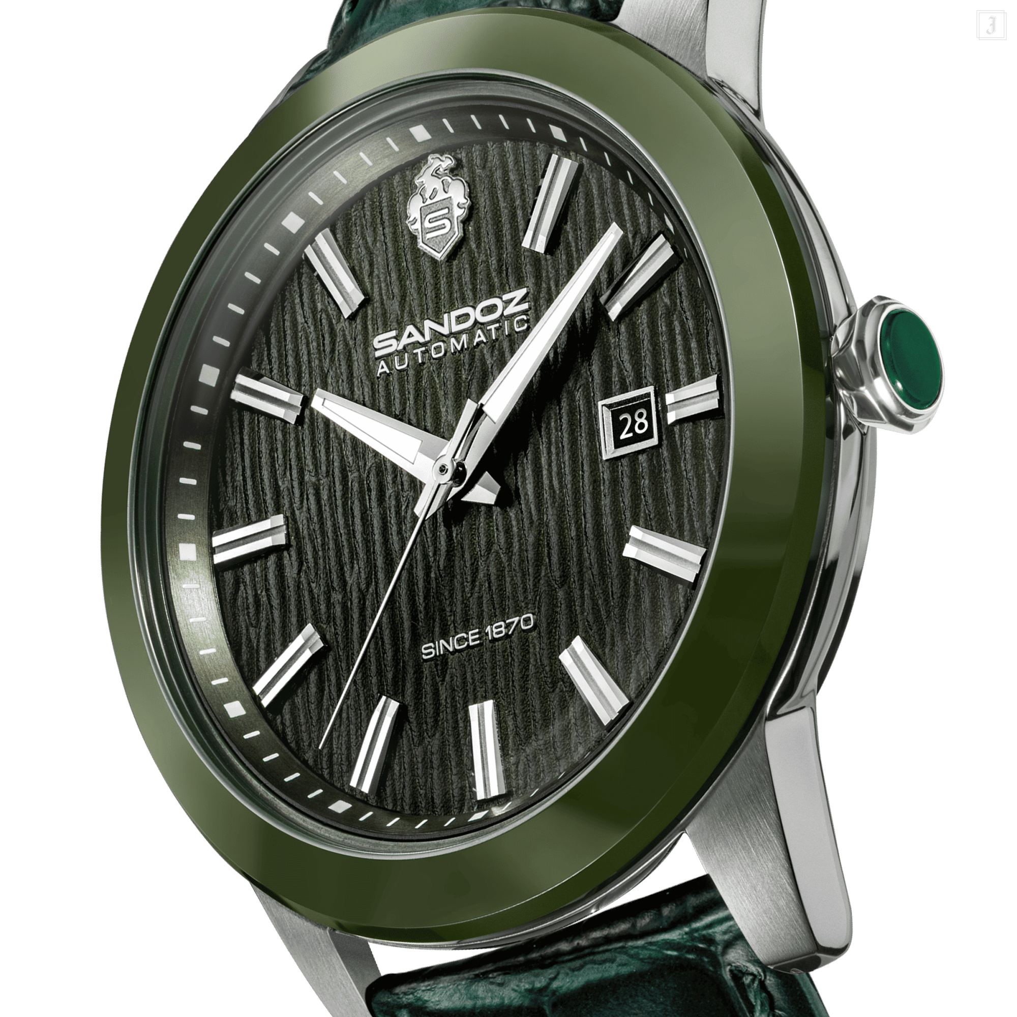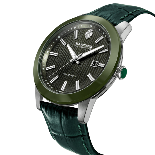 Tivoli is Sandoz’s take on everyday sophistication - bold where it counts, grounded in the details. Its 44mm case makes a confident statement, framed by a green ceramic bezel that adds a sharp, modern edge. The vertically textured green dial brings depth without distraction, with silver-toned markers and luminous hands that stay legible no matter the light. At the center, a three-hand automatic movement with date keeps time ticking smoothly. It’s all tied together with a rich green leather strap - versatile, comfortable, and finished with just the right amount of polish.