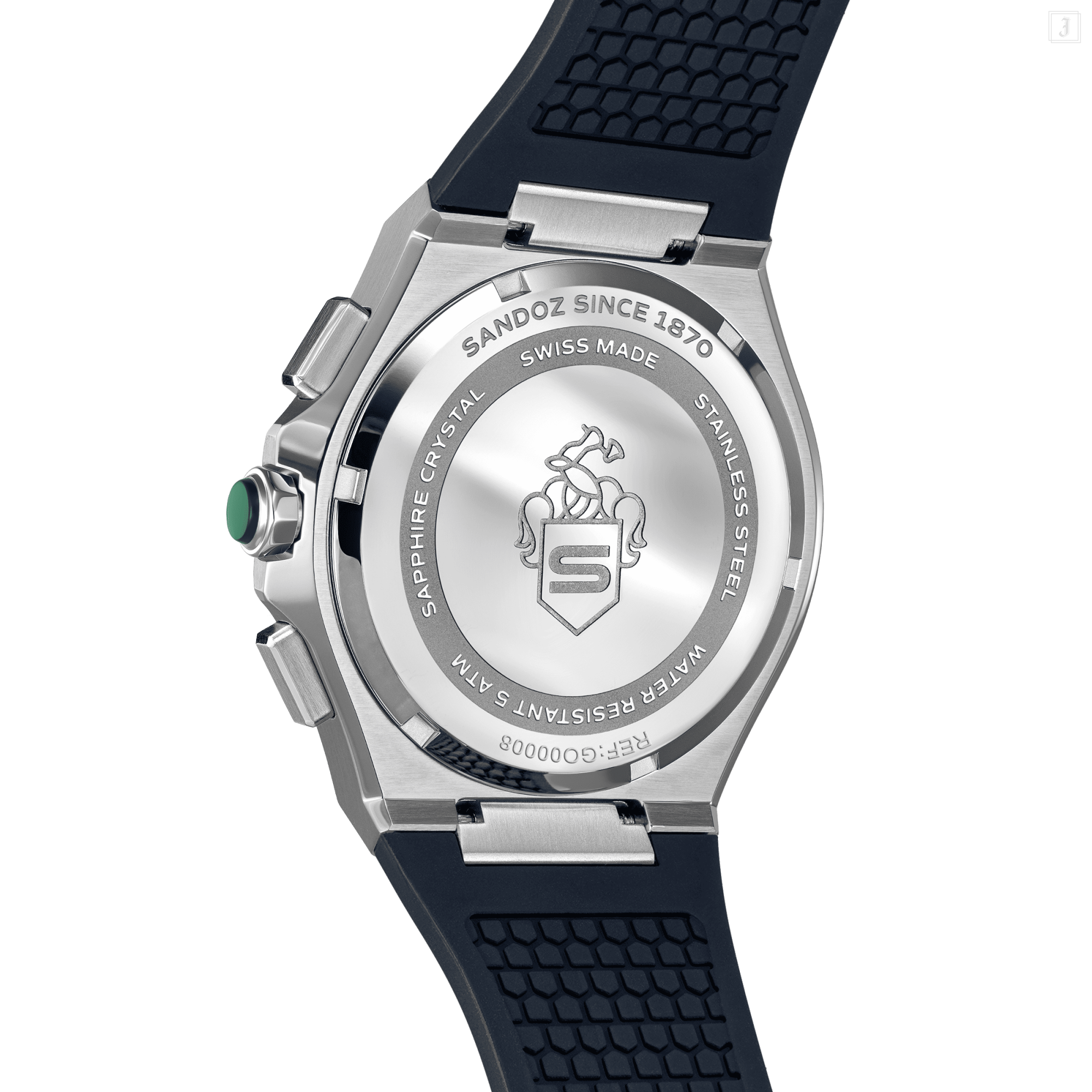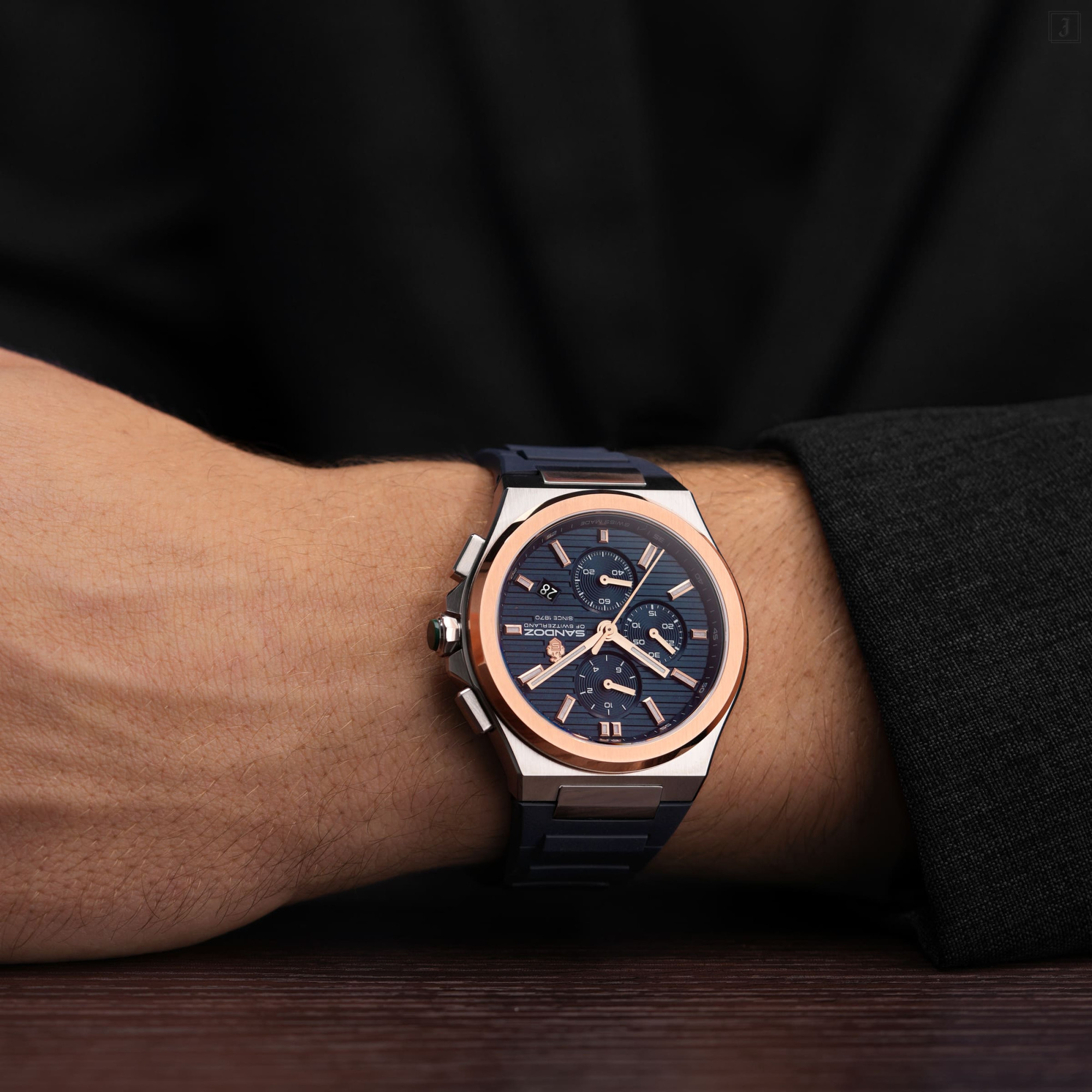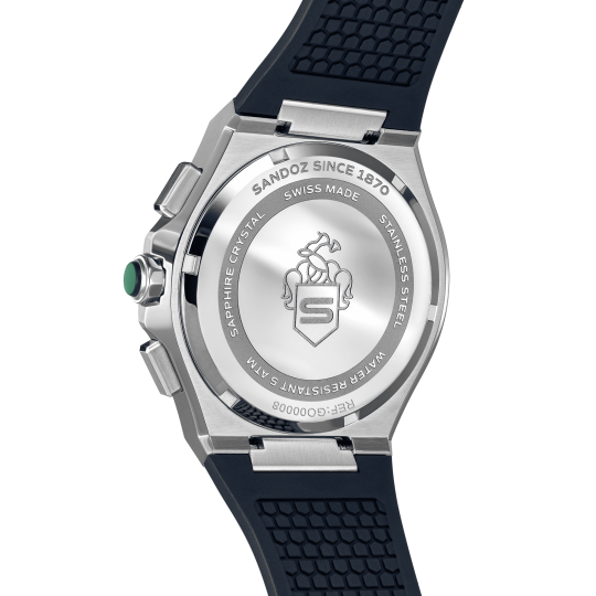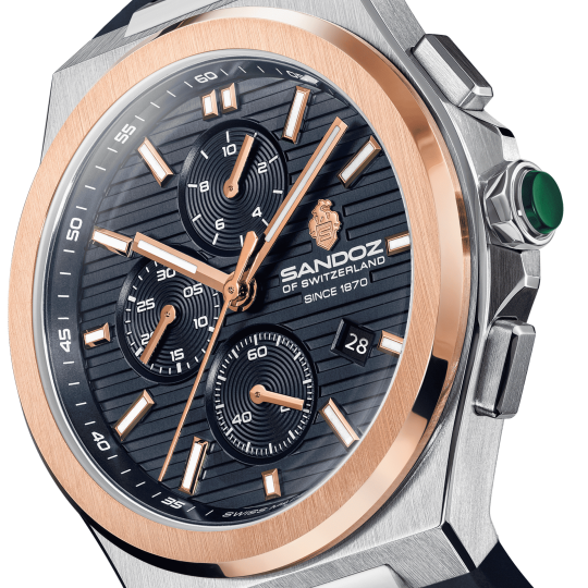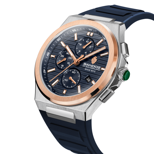 Blending Swiss precision with a sporty soul, Chanet, a quartz chronograph embodies Swiss excellence. The blue patterned dial is thoughtfully composed, with three sub-dials arranged in perfect symmetry. Luminous rose gold markers enhance legibility across all light conditions, while the durable blue strap - adds a modern, tactile contrast. Marrying modern aesthetics with timeless function, this piece is unmistakably Sandoz. |
