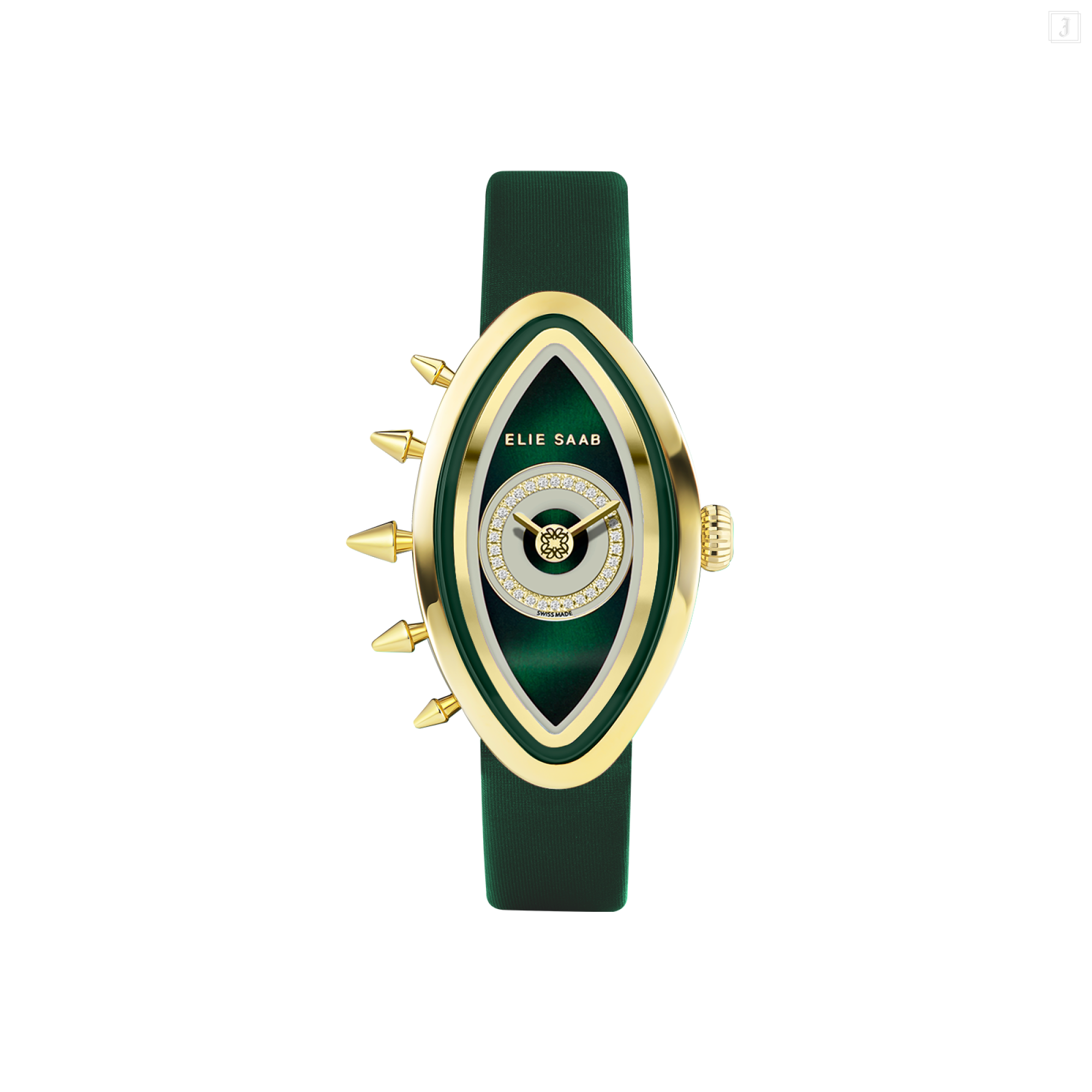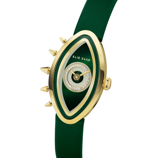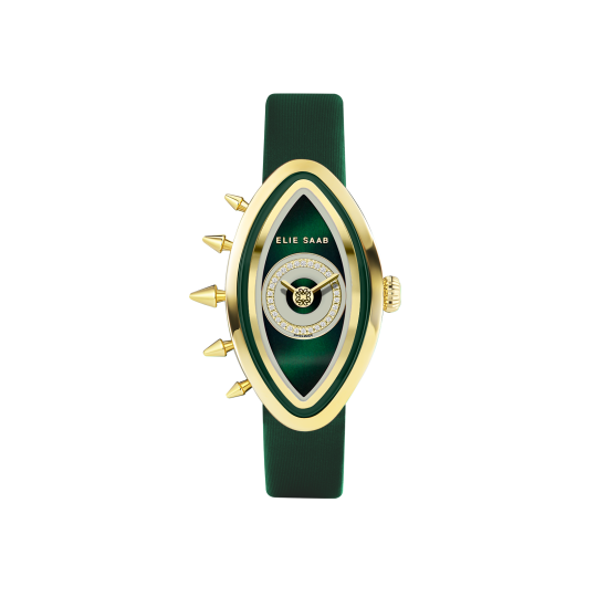For those daring to be different, this sleek Swiss-movement gold-plated watch is a style statement that captures the essence of excellence. The case includes a dual-toned green sapphire dial adorned with 30 diamonds. The green satin strap completes the chic, modern look. Water resistance is 3 ATM. Diamond clarity is VS-1. |