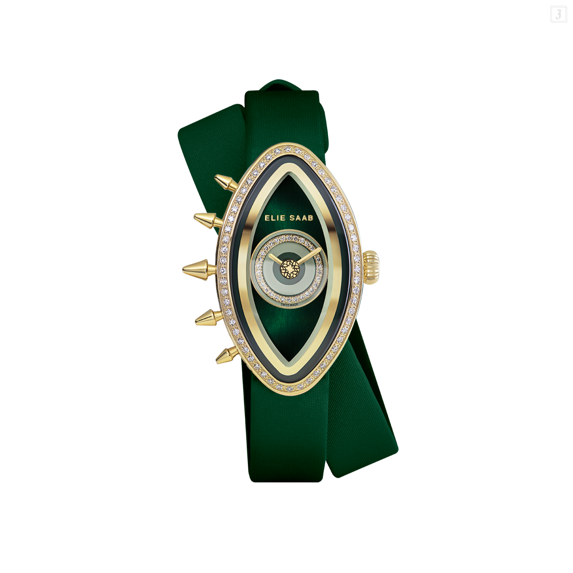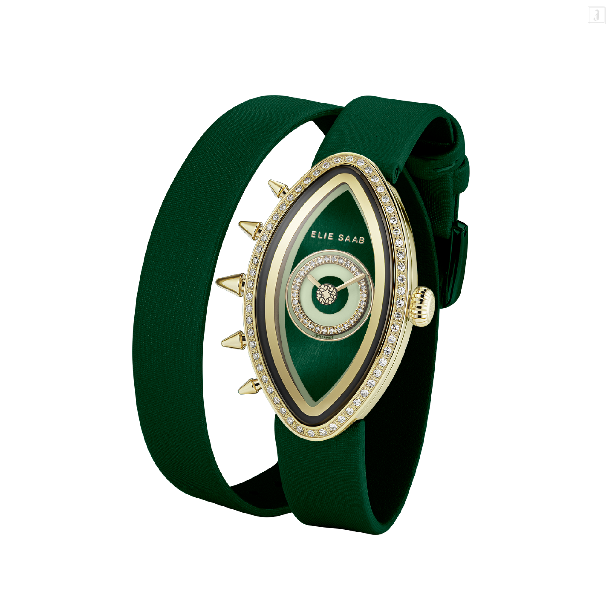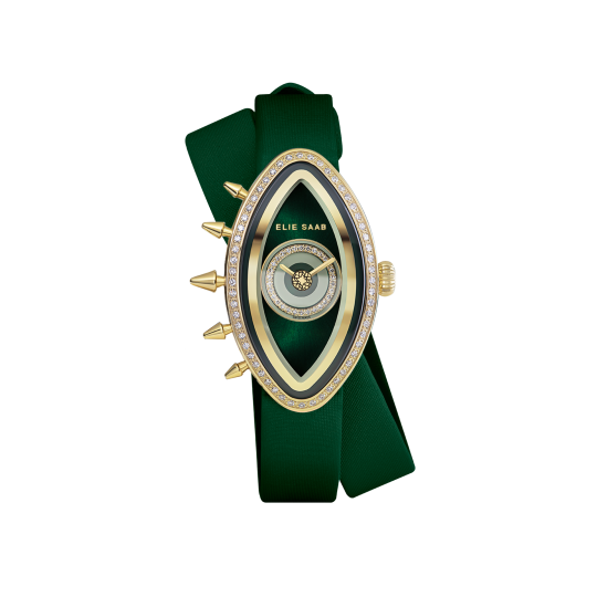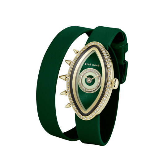 For those daring to be different, this sleek Swiss-movement gold-plated watch is a style statement that captures the essence of excellence. The case includes a dual-toned green sapphire dial surrounded by 86 diamonds on the bezel and dial. The green double strap band completes the chic, modern look. Water resistance is 3 ATM. Diamond clarity is VS-1. |