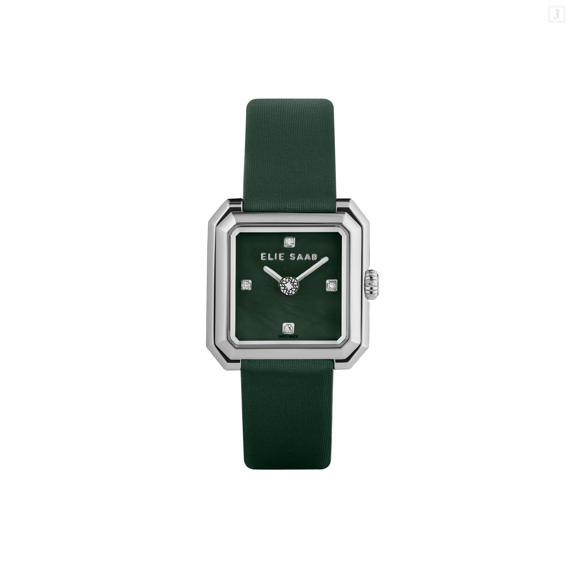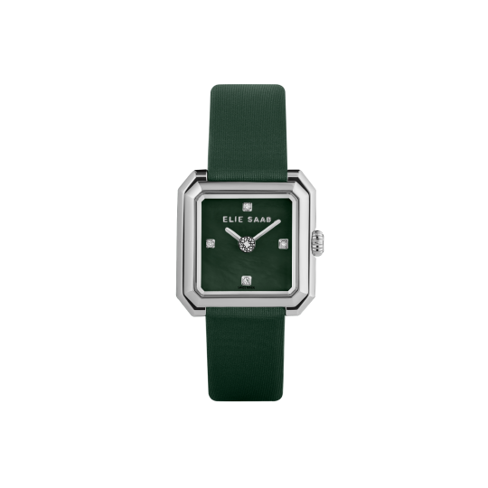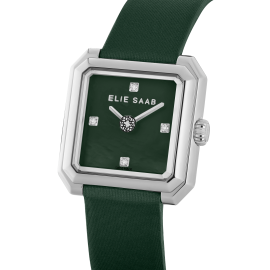 Chic and elegant, with a square-shaped Stainless Steel case, this Swiss-movement watch is adorned with a green mother-of-pearl dial featuring four diamonds on the indexes. The green satin strap with butterfly buckle completes the lustrous look. Water resistance is 5 ATM. Diamond clarity is VS-1. |