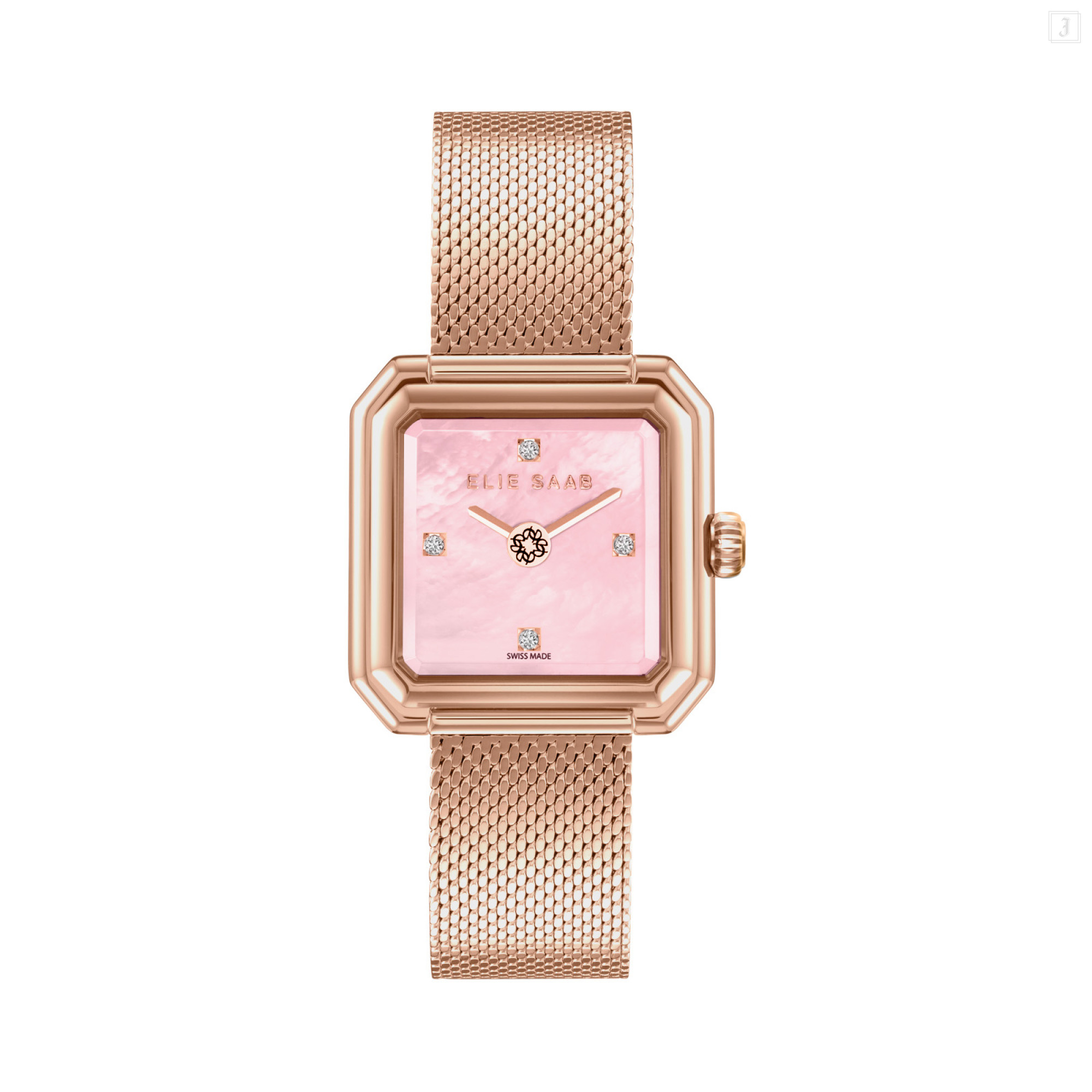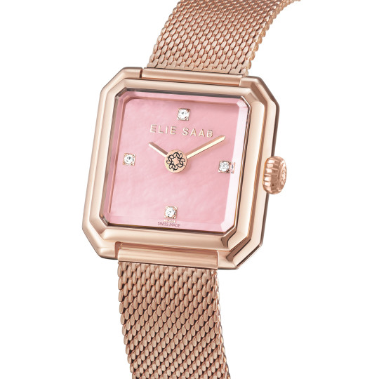 Chic and elegant, with a square-shaped rose gold-plated case, this Swiss-movement watch is adorned with a pink mother-of-pearl dial and four diamonds on the dial. A rose gold-plated mesh band and butterfly buckle complete the look. |