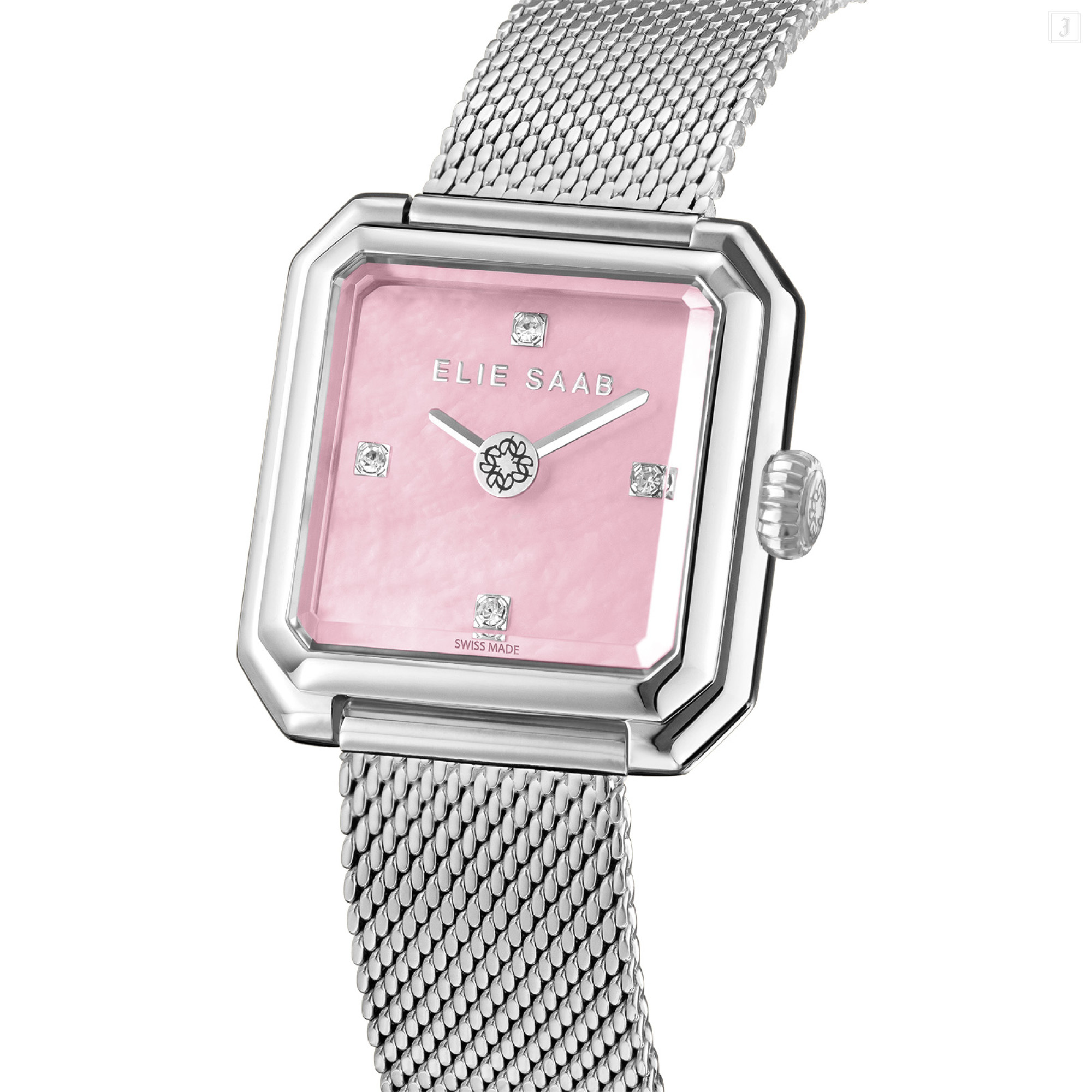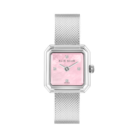 Chic and elegant, with a square-shaped stainless steel case, this Swiss-movement watch is adorned with a pink mother-of-pearl dial and four diamonds on the dial. A stainless steel mesh band and butterfly buckle complete the look. |