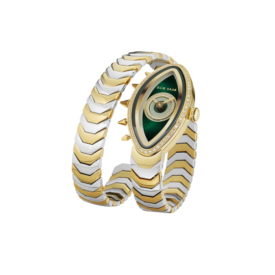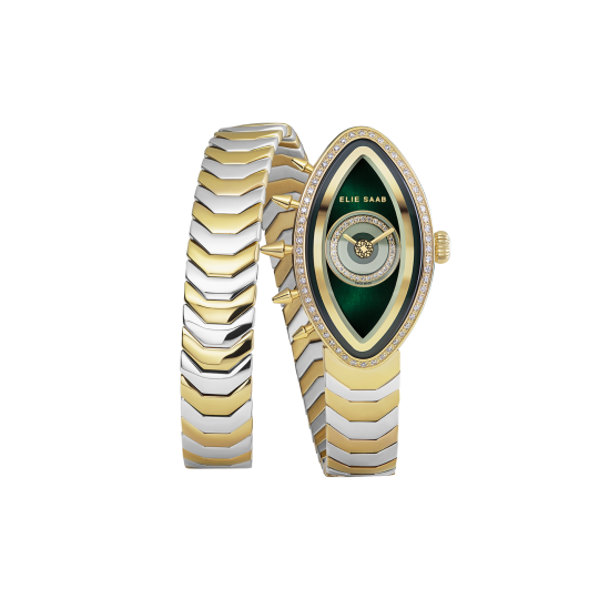 For those daring to be different, this sleek Swiss-movement gold-plated watch is a style statement that captures the essence of excellence. The 23x40mm eye-shaped case features a stunning dual-toned green sapphire dial, surrounded by 86 diamonds on the bezel and dial. A stainless steel and gold-plated double bracelet with butterfly buckle completes the chic, modern look. Water resistance is 3 ATM. Diamond clarity is VS-1. |