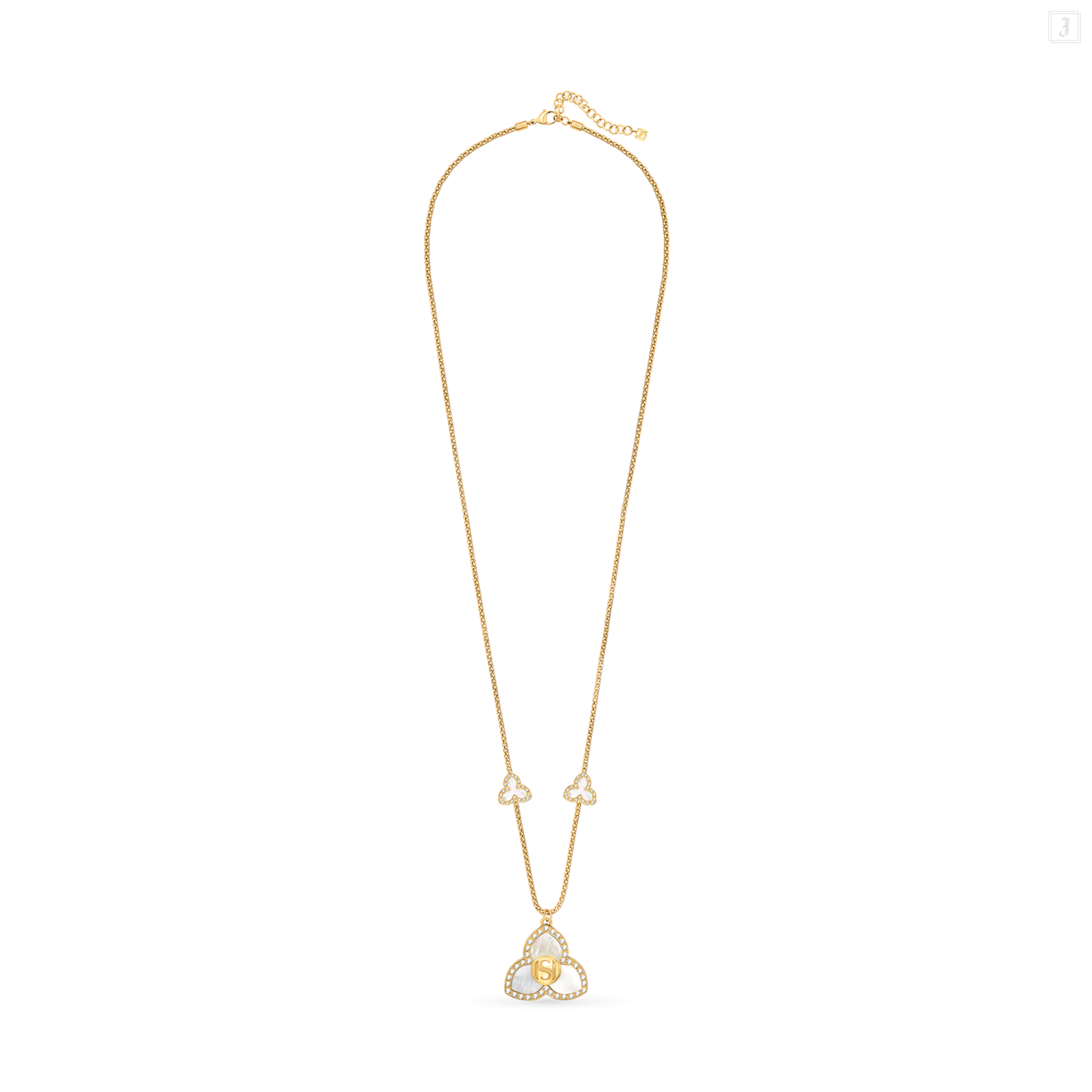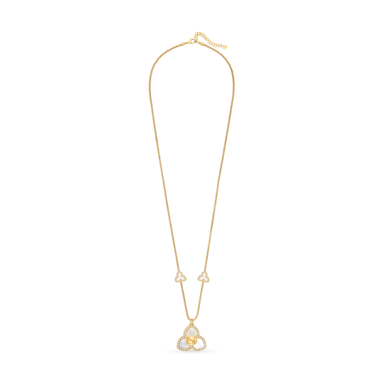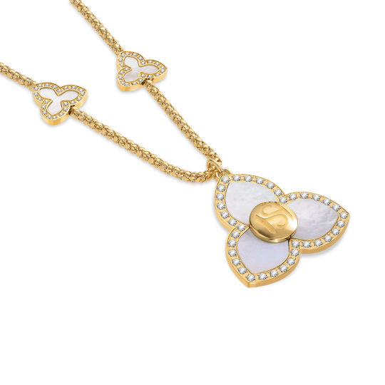 A captivating fusion of heritage and modernity, Burj necklace is a striking statement piece inspired by the soaring elegance of the world’s tallest tower. In graceful symmetry, a mother-of-pearl pendant in a three-petal motif is complemented by two smaller matching motifs along the chain - echoing architectural lines with refined femininity. Finished in radiant gold plating, this luminous design brings depth, balance, and a bold sense of presence to any ensemble. |
