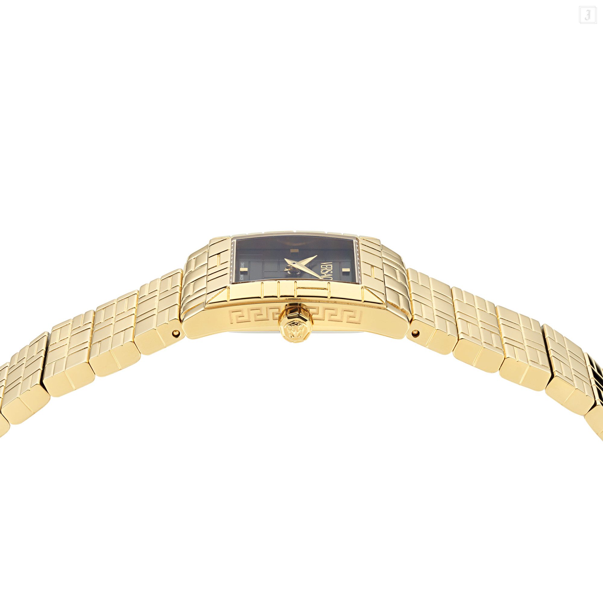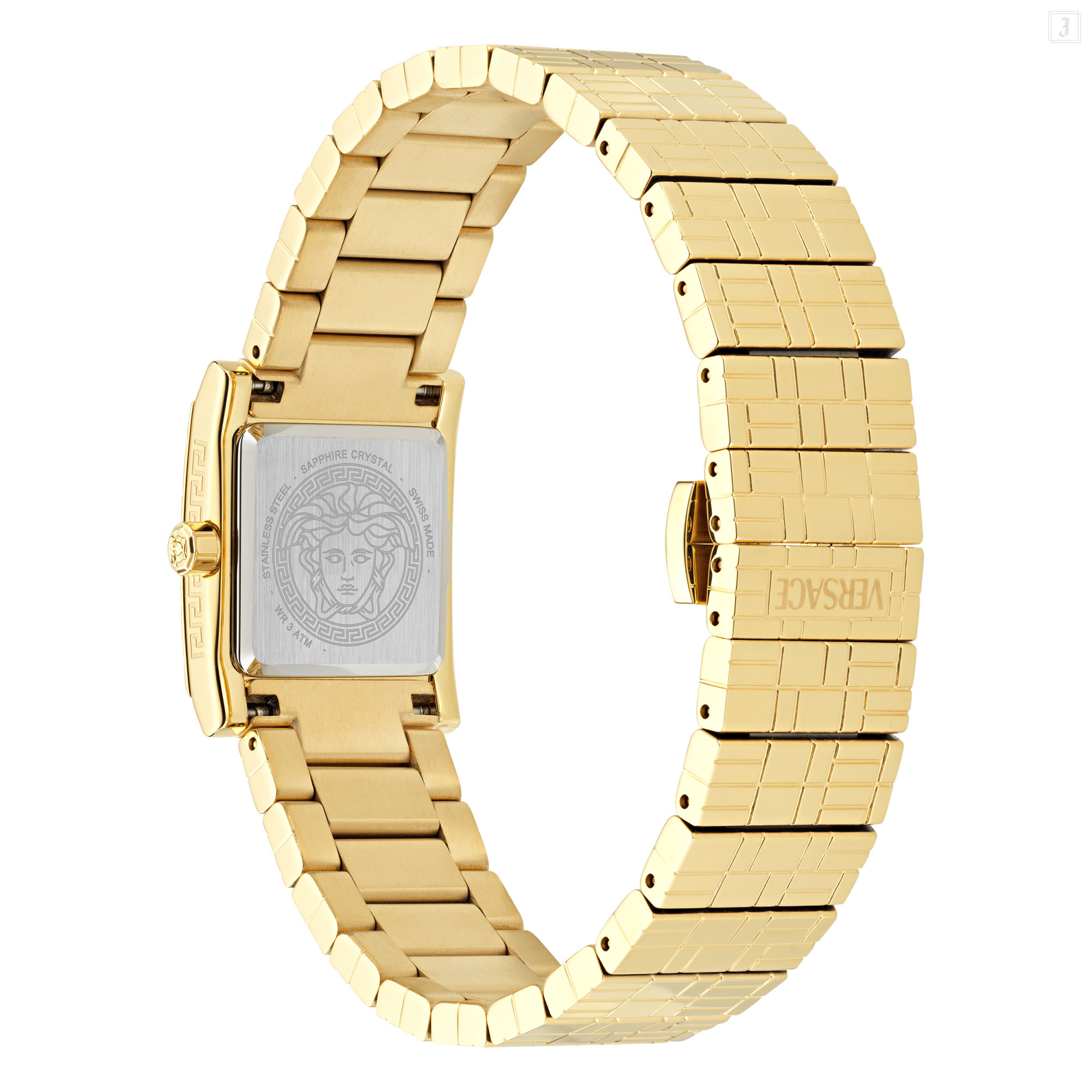 An elegant timepiece formed as an intricate mosaic with a squared case and metal bracelet. The watch has a 2 hands movement with dial numbers represented by square mosaic tiles and the Versace logo featuring at 12 o'clock. All Versace watches are guaranteed by the 'Swiss Made' marking. All stainless steel is recycled. |