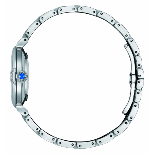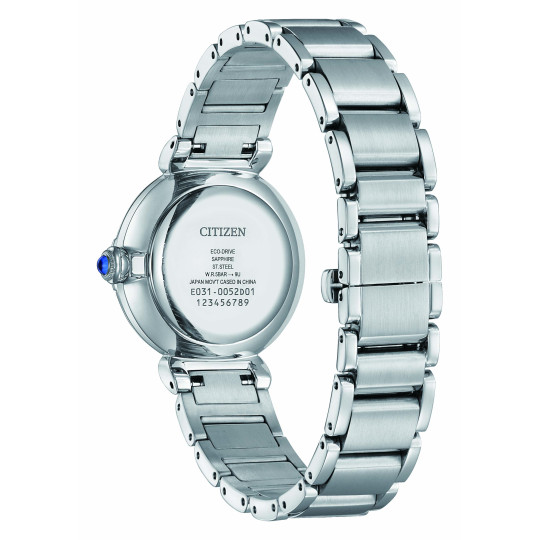 Classic lines and hints of romance make this newest piece to our ladies' collection, the Citizen L May bells, a glamorous addition of sustainable luxury. With a case design inspired by May bells featuring the curved, sleek lines of the flowers, the bezel shape has a distinct feature at the 3 o’clock position, where the crown resembles an elegant perfume stopper. Featuring a white, mother-of-pearl dial made of recycled materials, including a recycled polycarbonate base under the dial, and showcased on a sleek, silver-tone stainless steel case and bracelet. The dial also has a diamond that gives focus to the 8 o’clock position and is finished with a sapphire crystal. Sustainably powered by any light with our proprietary Eco-Drive technology that never needs a battery, this elegant women’s watch is the perfect dressed up look with high-powered performance. Caliber E031.