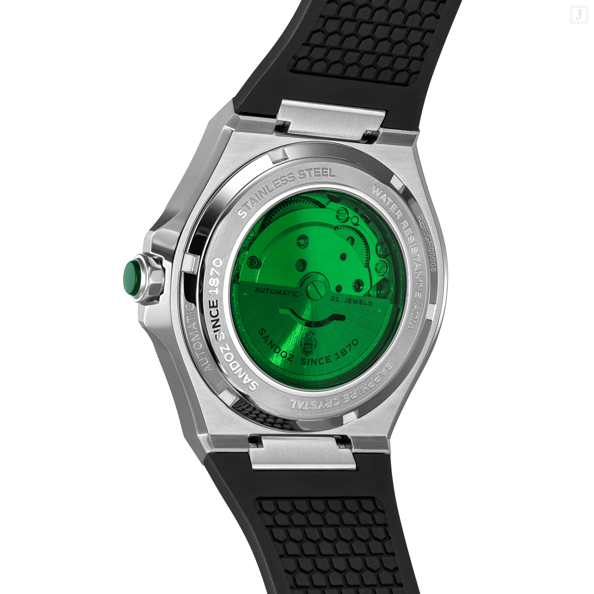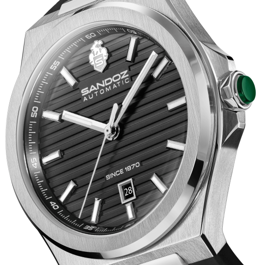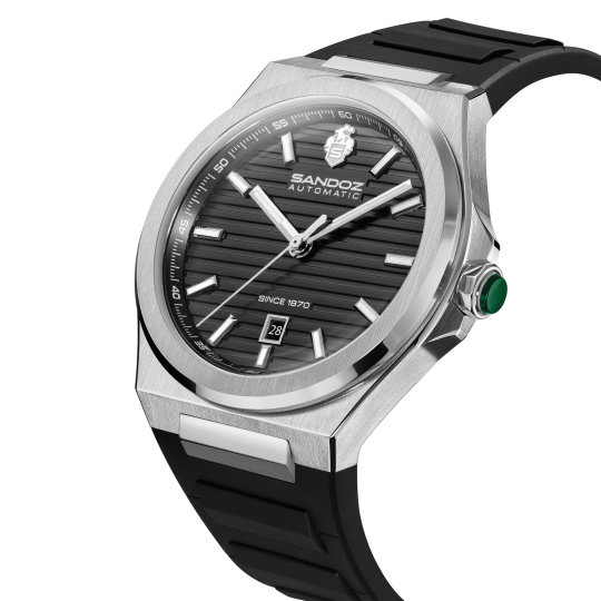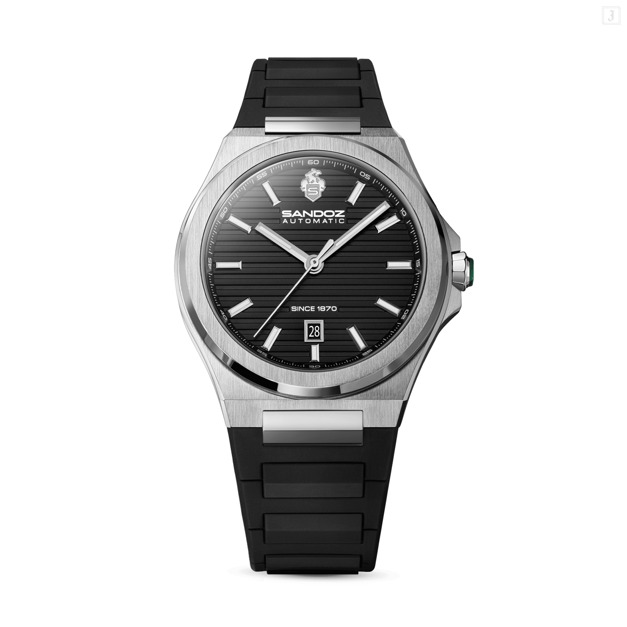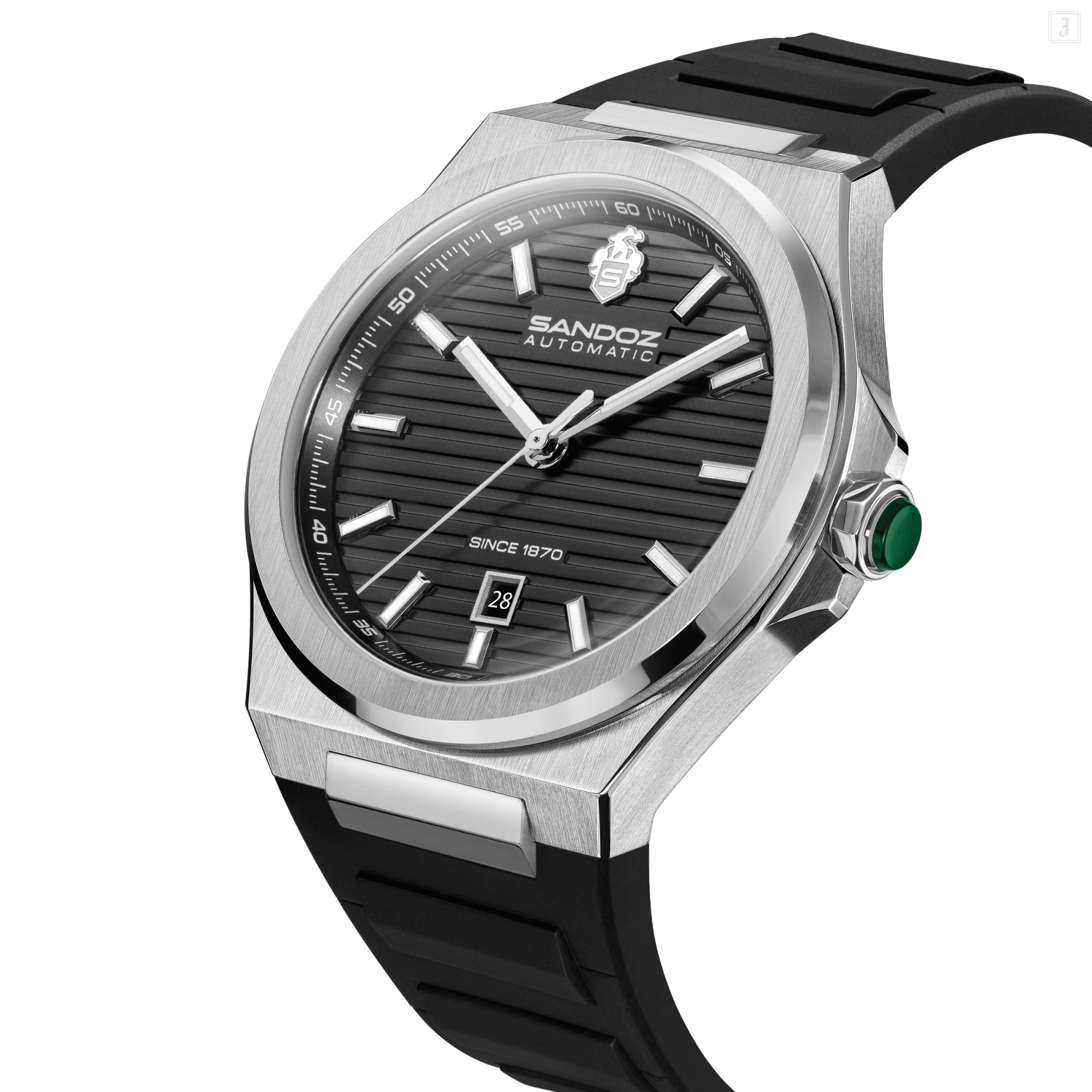 A study in balance, Chanet - an elegant sport automatic timepiece brings together strength and sophistication with quiet assurance. The 42mm case has a bold, modern presence, all clean lines and considered proportions, topped with a flat sapphire crystal that gives it a crisp, architectural feel. The black dial is quietly assertive, patterned for depth. Luminous silver hands and indexes cut through, offering clarity. Inside, the automatic movement keeps steady time, powering a classic three-hand layout with a date window. On the wrist, the black strap adds a touch of athleticism without going full-sport.