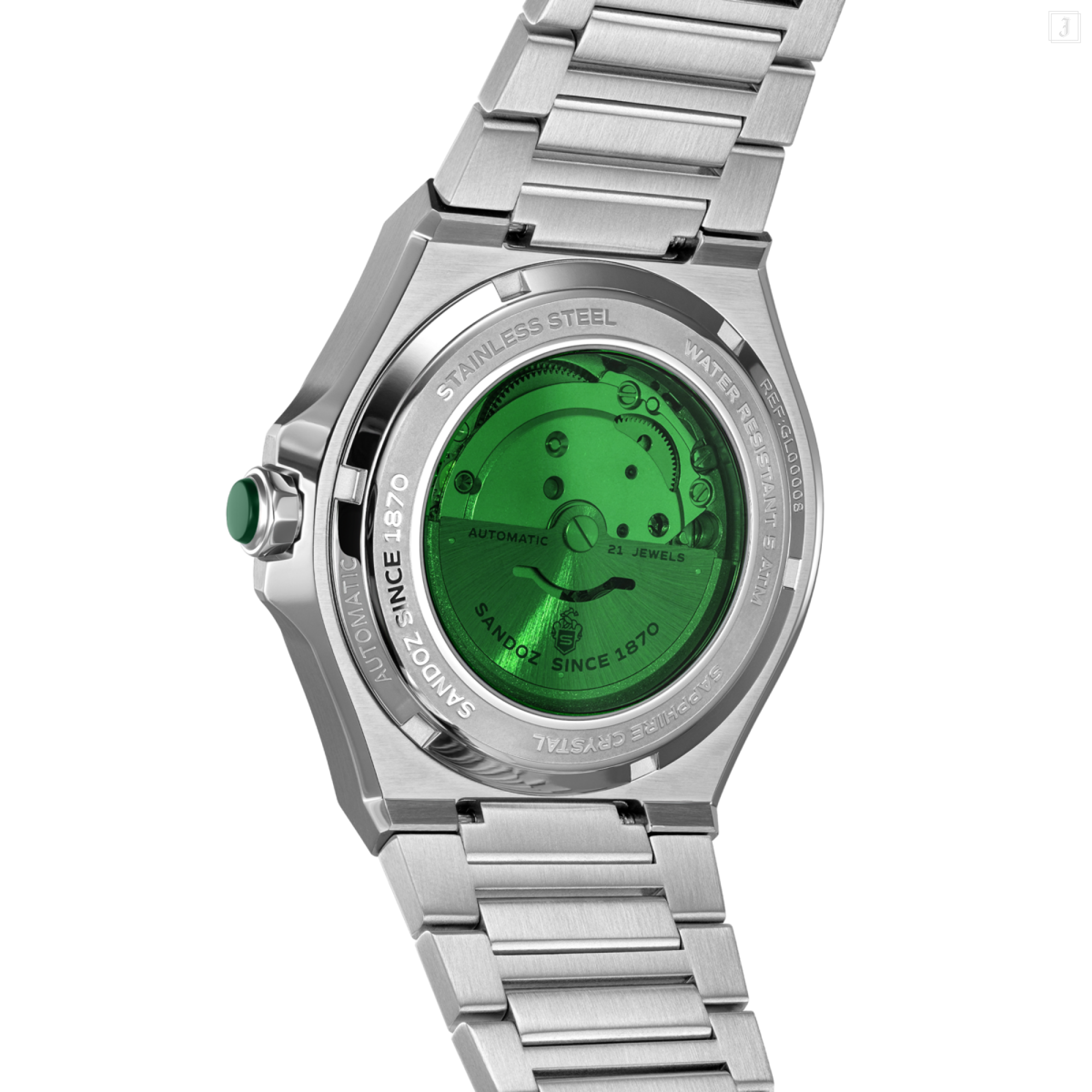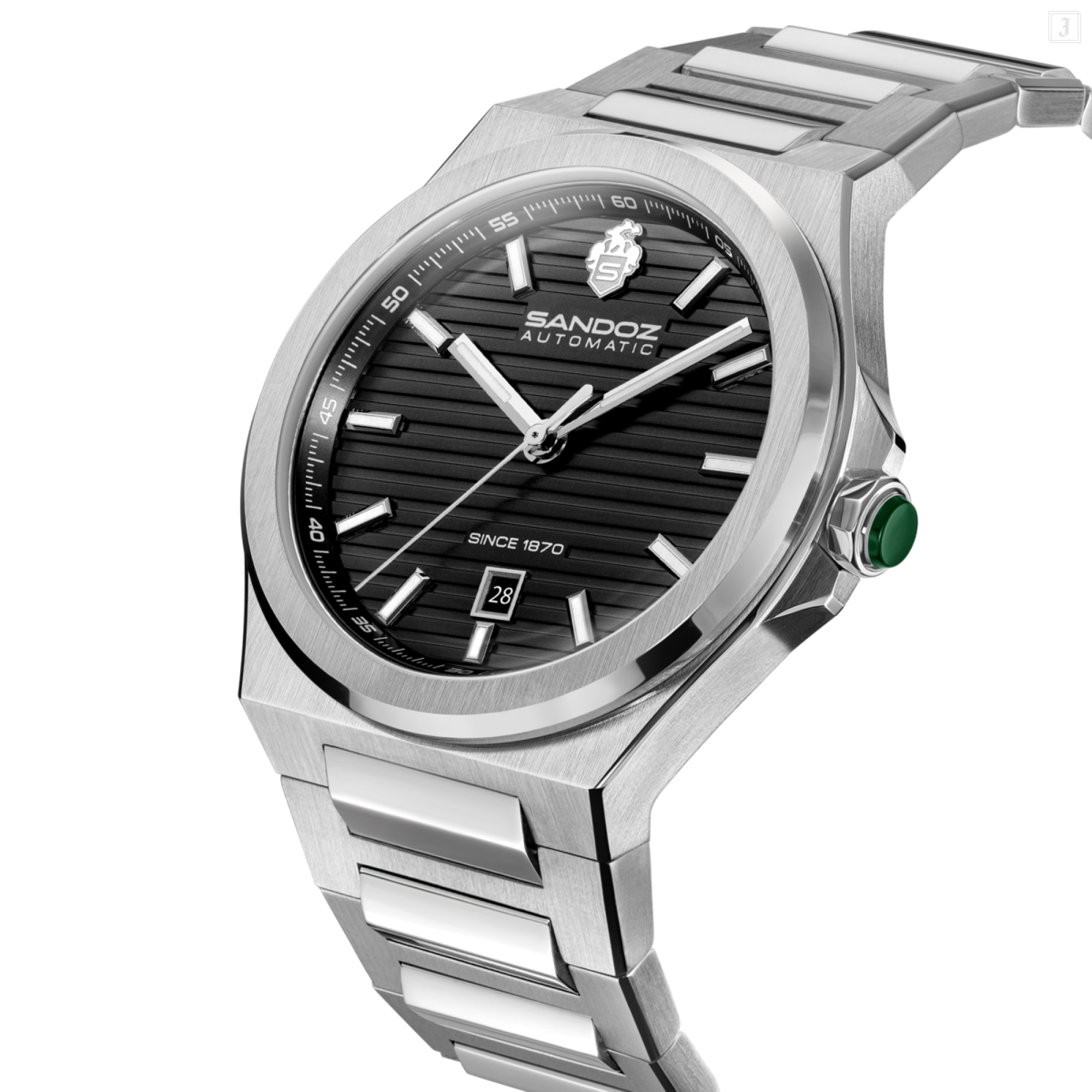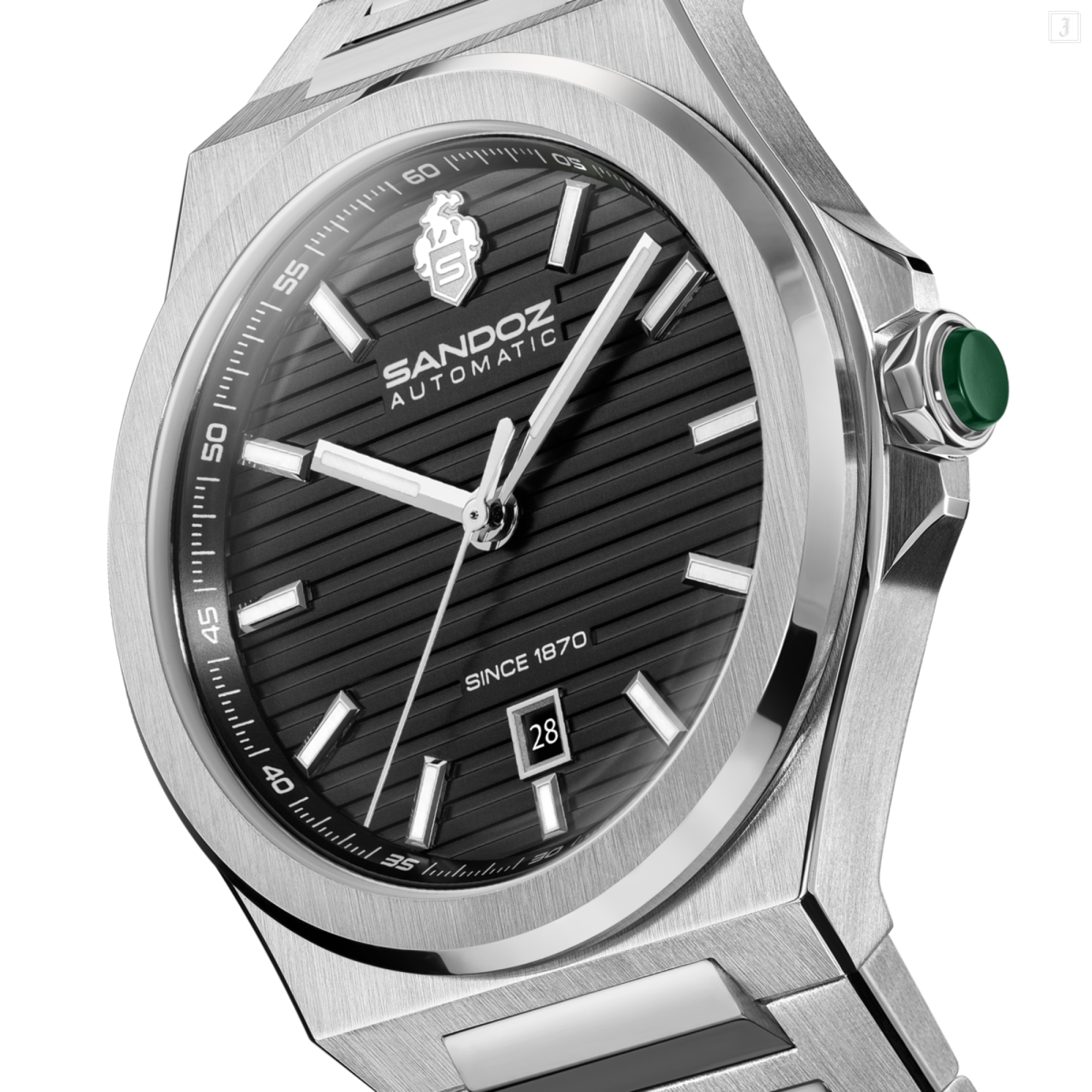 A study in balance, Chanet - an elegant sport automatic timepiece brings together strength and sophistication with quiet assurance. The 42mm case has a bold, modern presence, all clean lines and considered proportions, topped with a flat sapphire crystal that gives it a crisp, architectural feel. The black dial is quietly assertive, patterned for depth. Luminous silver hands and indexes cut through, offering clarity. Inside, the automatic movement keeps steady time, powering a classic three-hand layout with a date window. On the wrist, the sturdy bracelet adds a refined contrast to the overall design.
