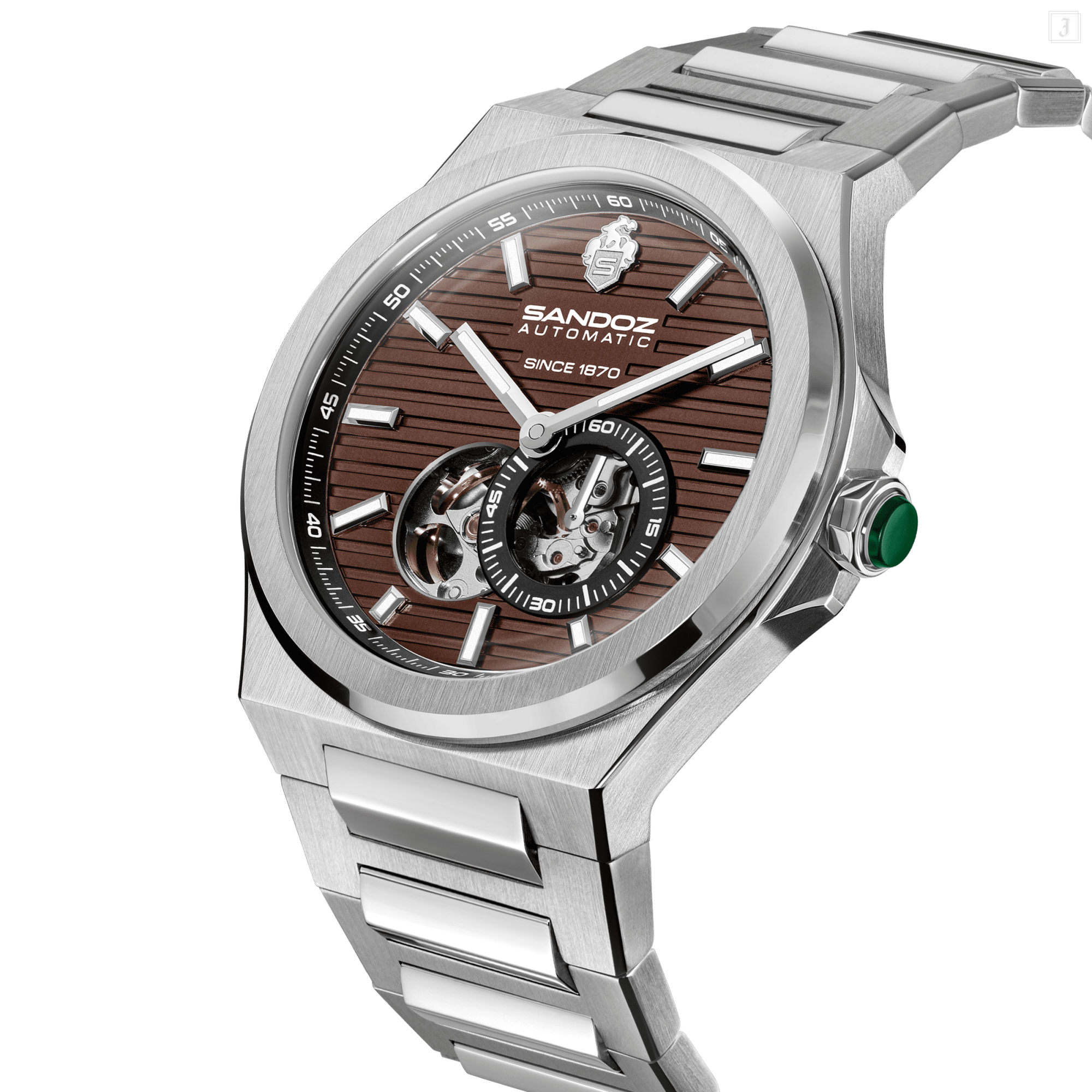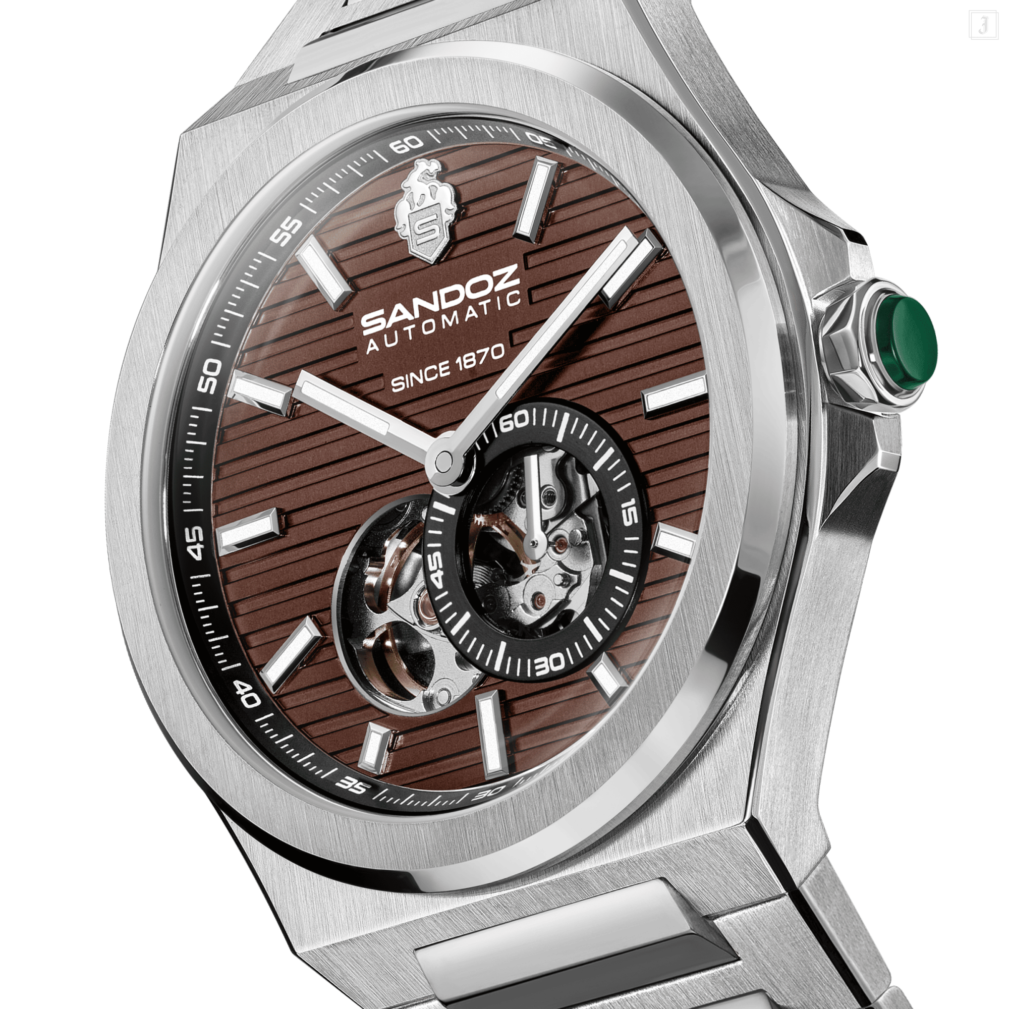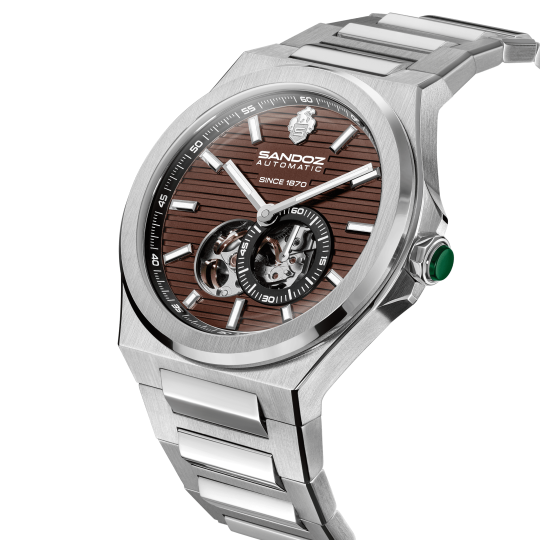 Chanet walks the line between elegance and sport without missing a beat. The 42mm case has a strong, modern profile, with clean surfaces and just the right amount of masculinity. Up top, a flat sapphire crystal keeps things sharp. The brown dial - patterned for depth, symmetrical by design, and framed by luminous silver hands and markers stay legible. At six o’clock, a neatly placed open-heart aperture offers a window into the automatic movement inside. The stylish bracelet grounds the piece in comfort and versatility.