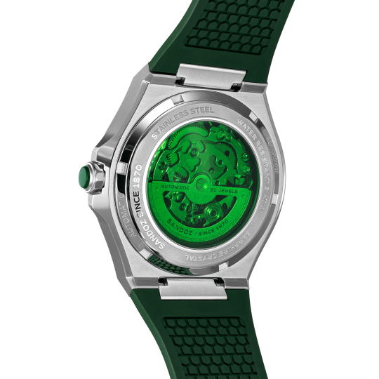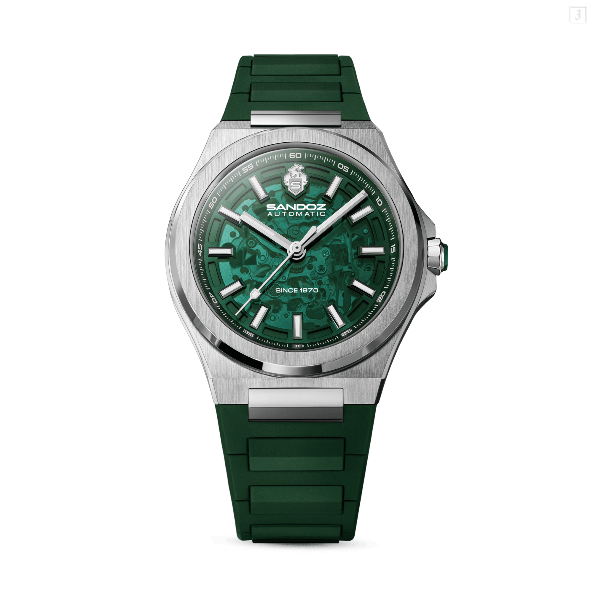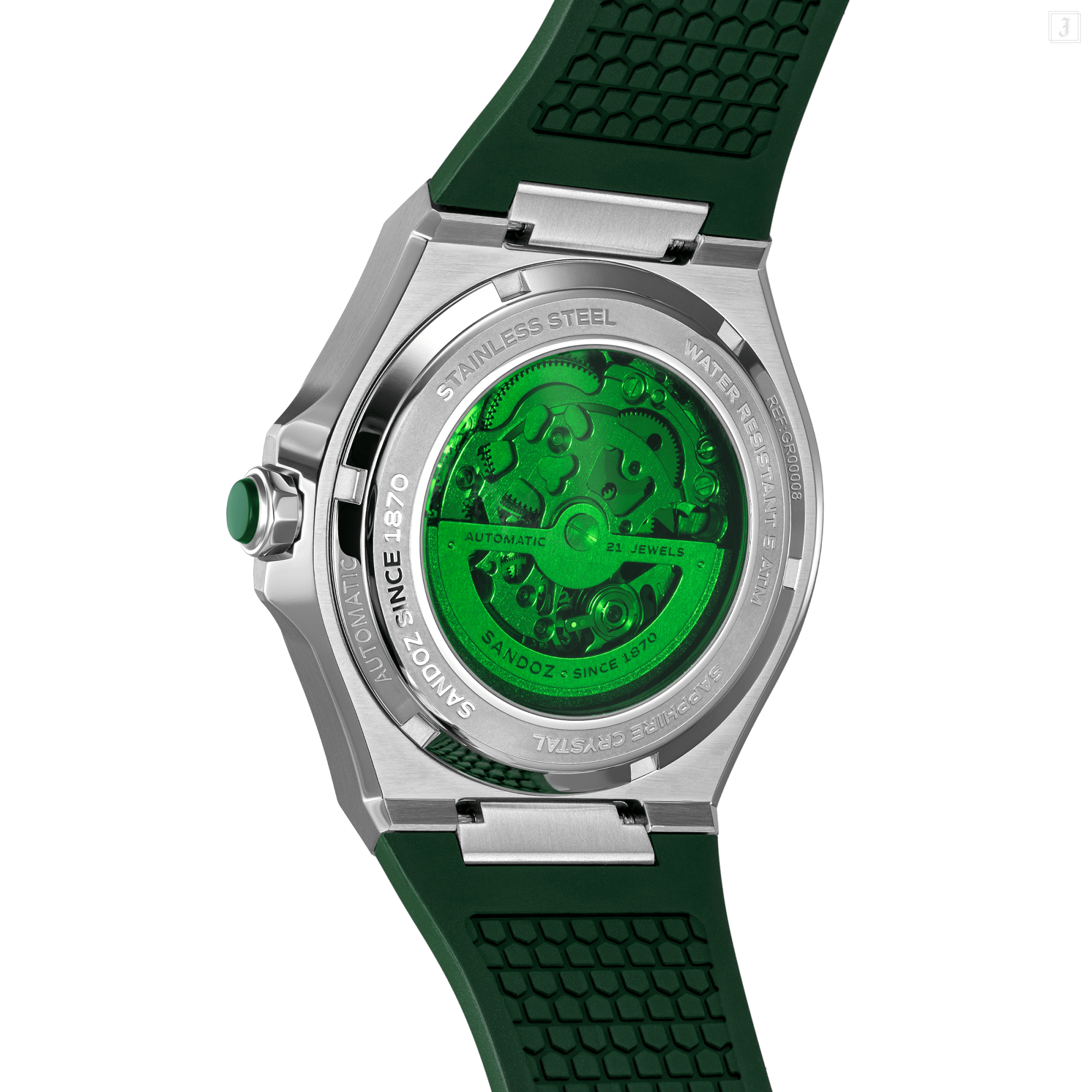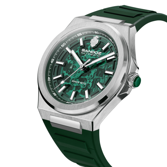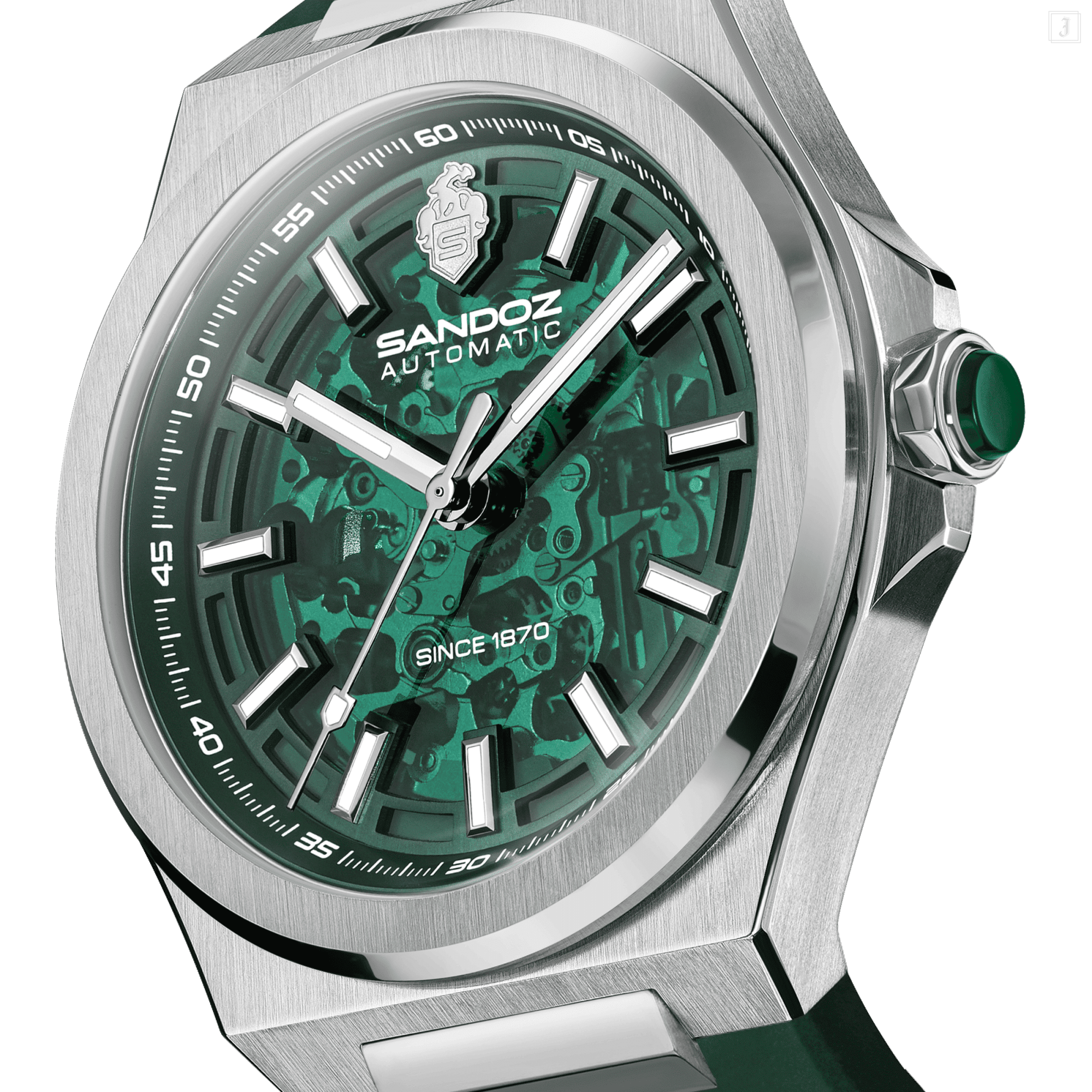 Chanet is Sandoz’s take on the modern sport watch - mechanical at heart, dressed with a little edge. Thoughtfully designed for the contemporary men, this automatic watch with clean lines and a flat sapphire crystal - keeps the profile crisp. With a skeletonized green layout, the dial shows just enough of the automatic movement ticking underneath. Silver-toned markers and luminous hands keep legibility in check. Paired with a durable green strap that matches the case in tone and attitude, the watch wears easy, whether you’re at a desk or on the move. It’s built for the everyday, but with enough detail to keep people looking twice.