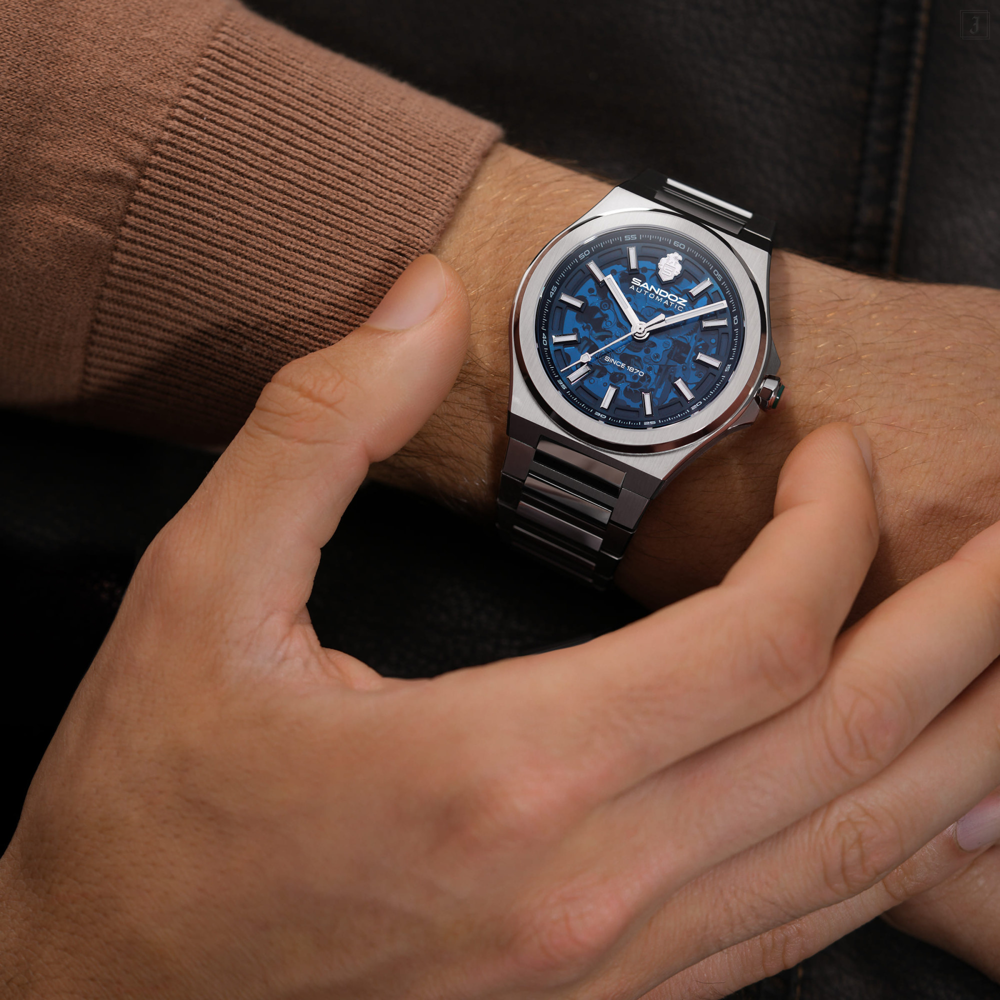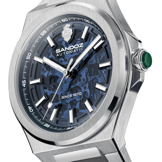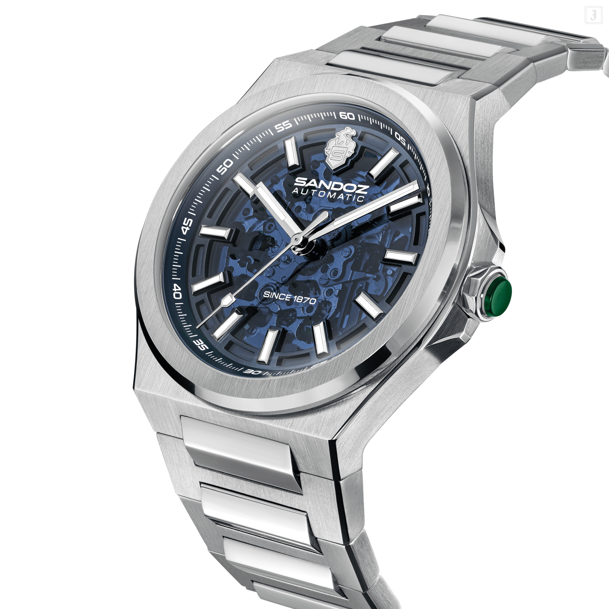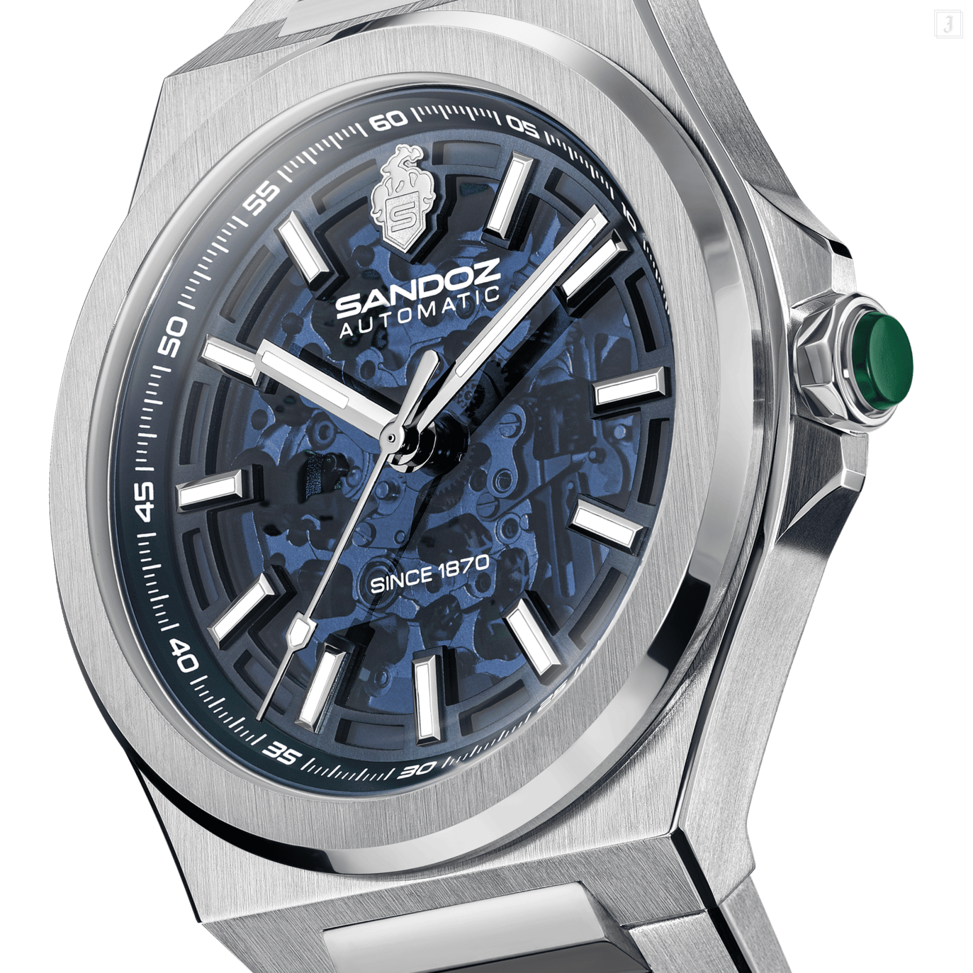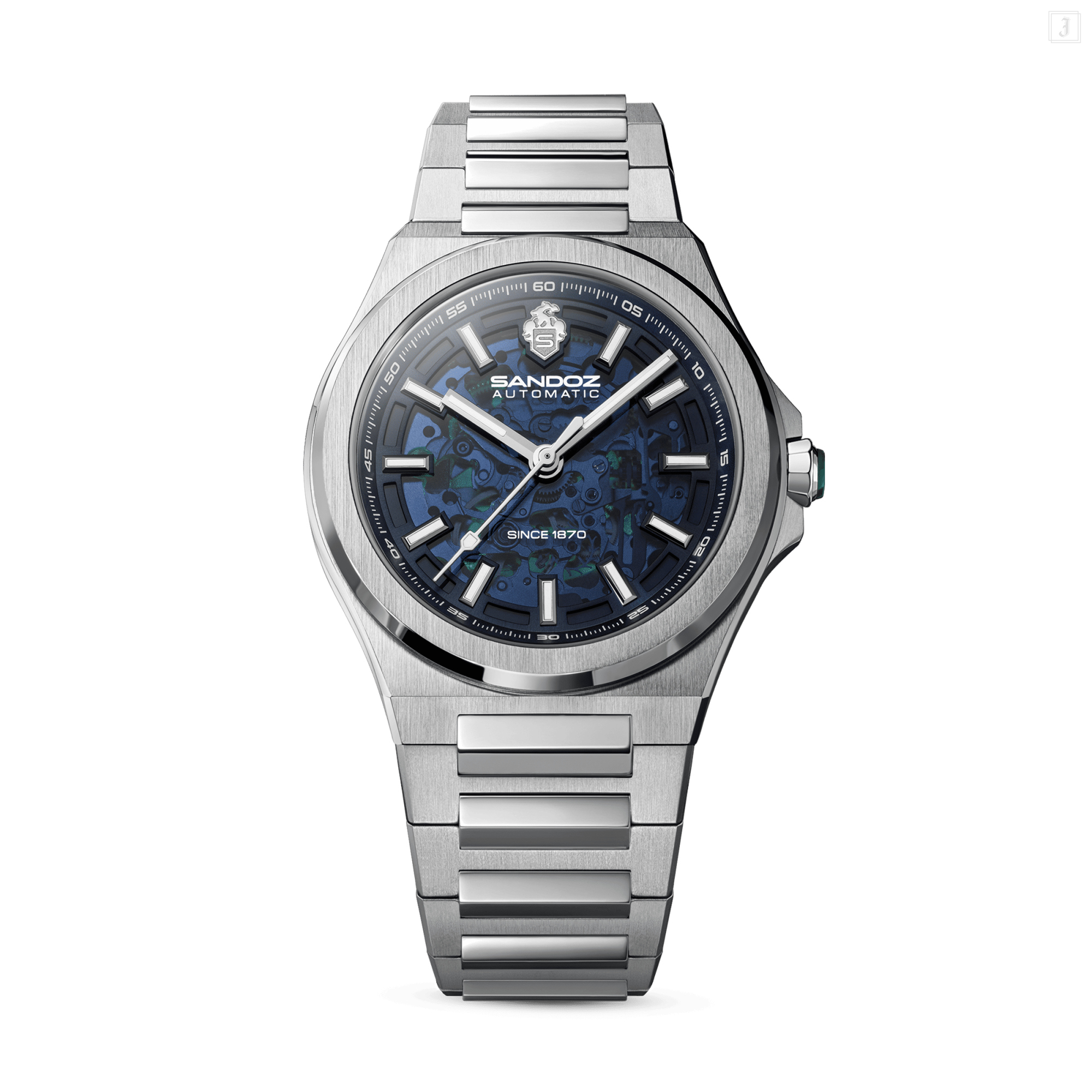 Chanet is Sandoz’s take on the modern sport watch - mechanical at heart, dressed with a little edge. Thoughtfully designed for the contemporary men, this automatic watch with clean lines and a flat sapphire crystal - keeps the profile crisp. With a skeletonized blue layout, the dial shows just enough of the automatic movement ticking underneath. Silver-toned markers and luminous hands keep legibility in check. Paired with a bracelet complements the case with a sense of continuity. Considered in every detail, this watch speaks to a contemporary sensibility, rooted in mechanical tradition.