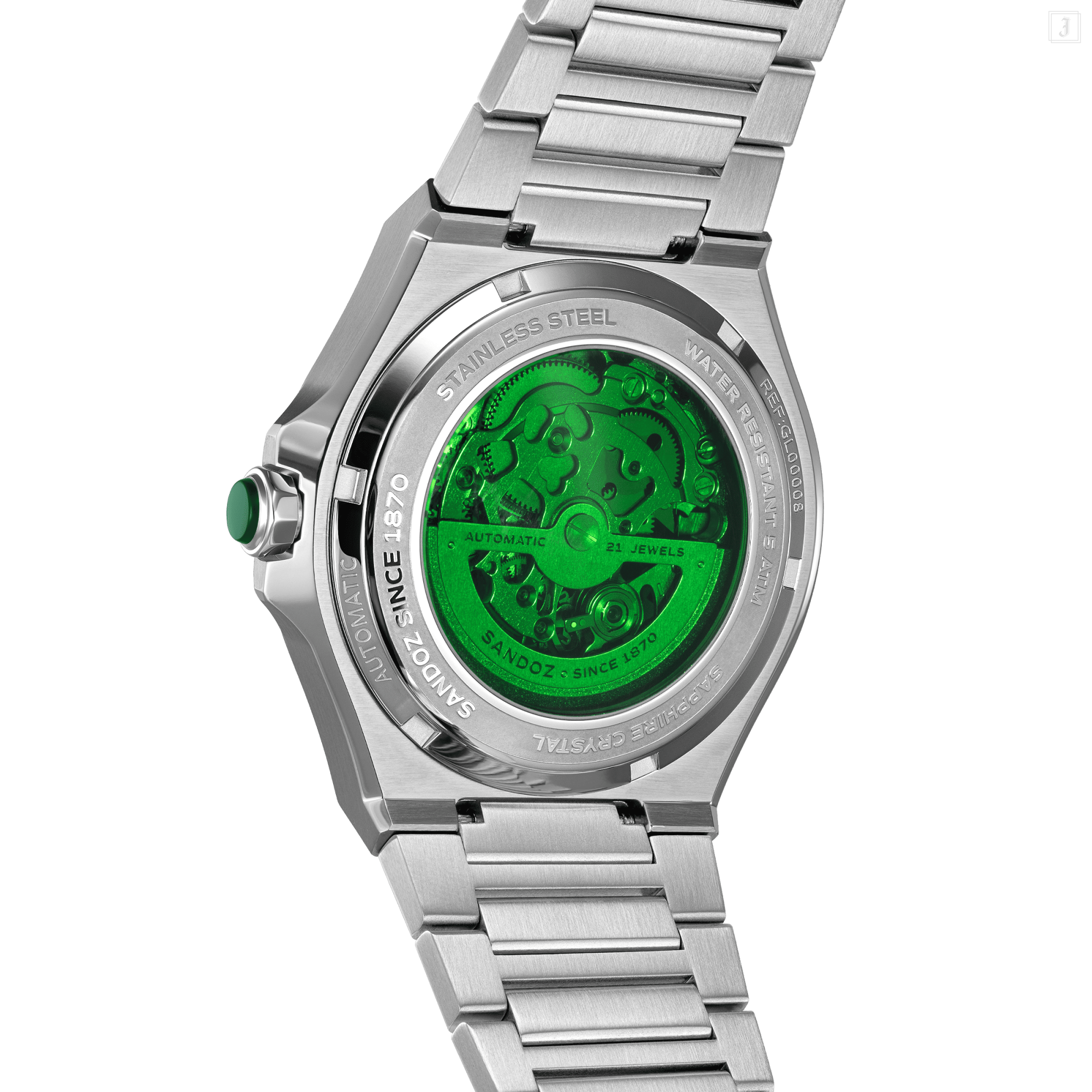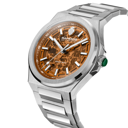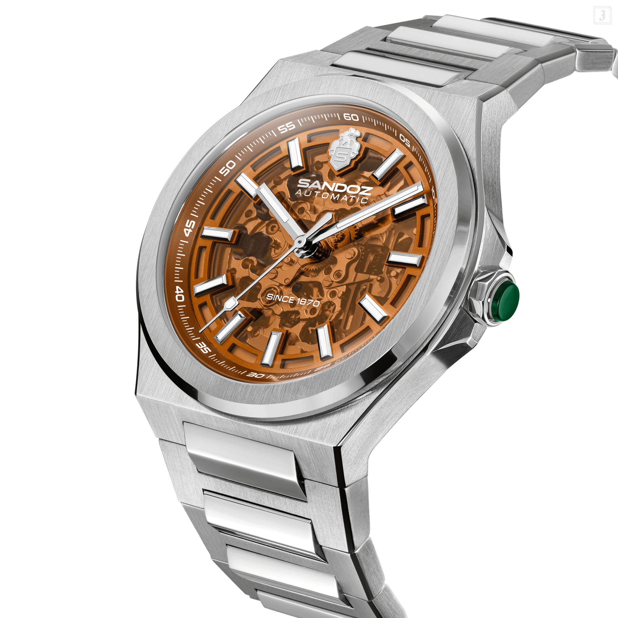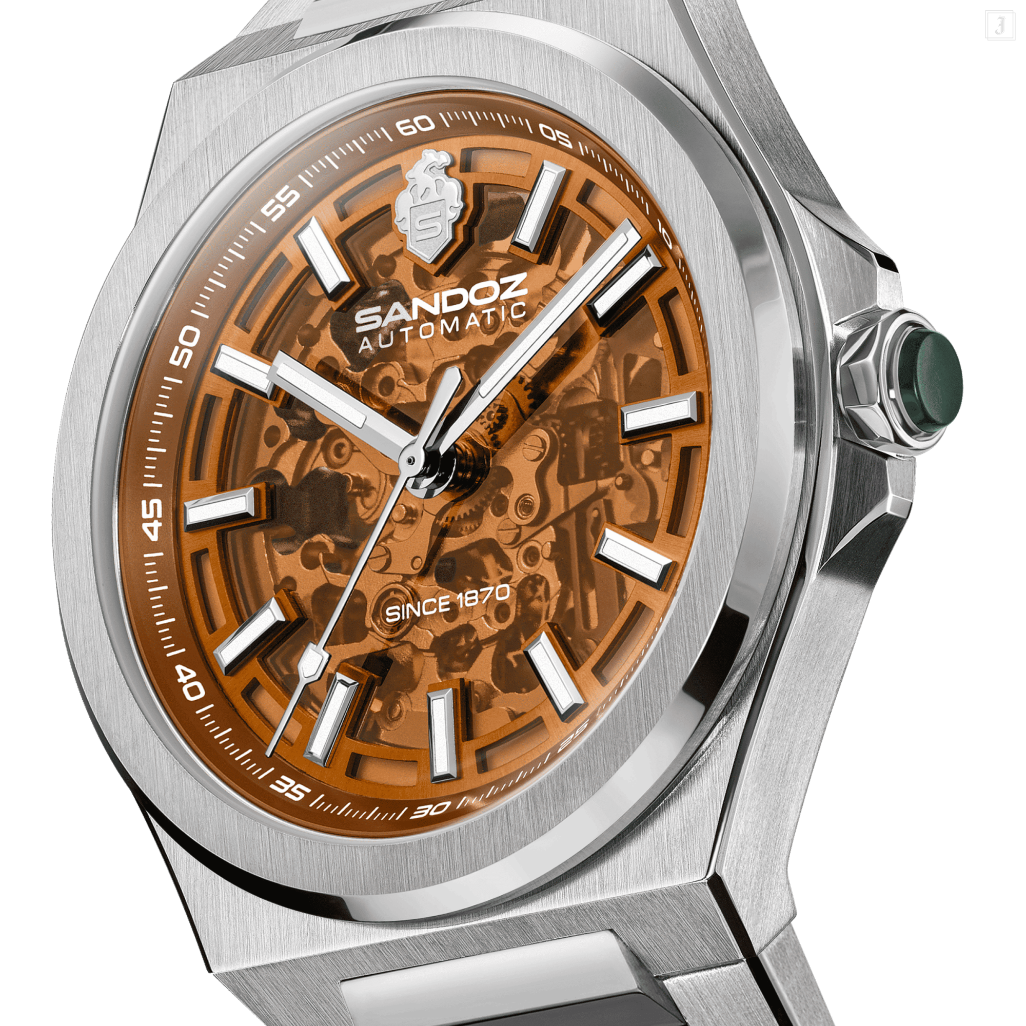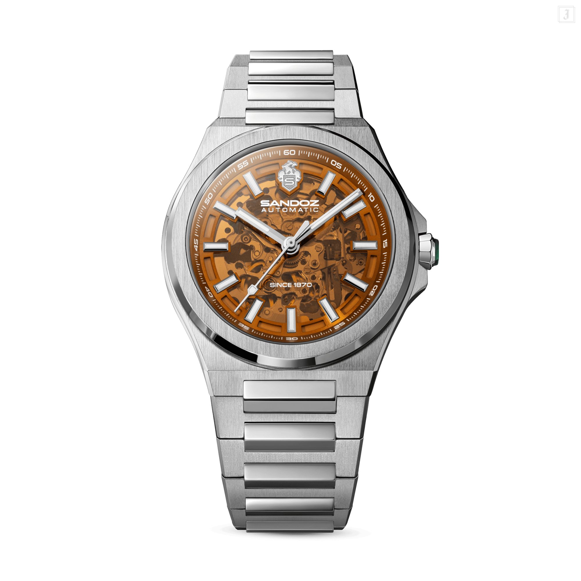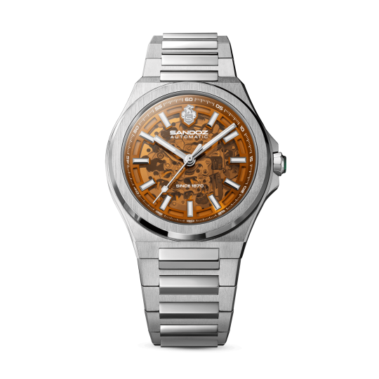 Chanet is Sandoz’s take on the modern sport watch - mechanical at heart, dressed with a little edge. Thoughtfully designed for the contemporary men, this automatic watch with clean lines and a flat sapphire crystal - keeps the profile crisp. With a skeletonized amber layout, the dial shows just enough of the automatic movement ticking underneath. Silver-toned markers and luminous hands keep legibility in check. Paired with a bracelet complements the case with a sense of continuity. Considered in every detail, this watch speaks to a contemporary sensibility, rooted in mechanical tradition.