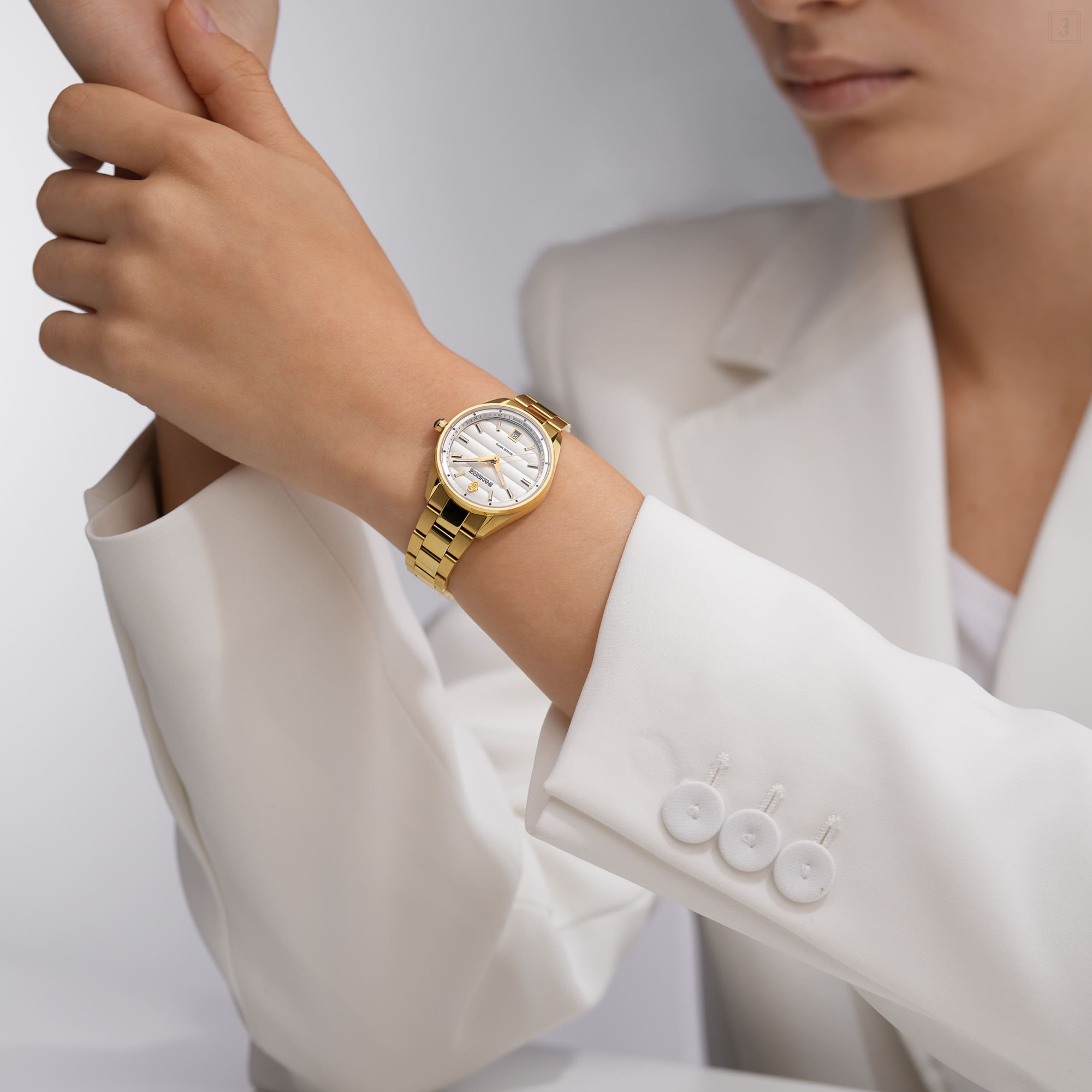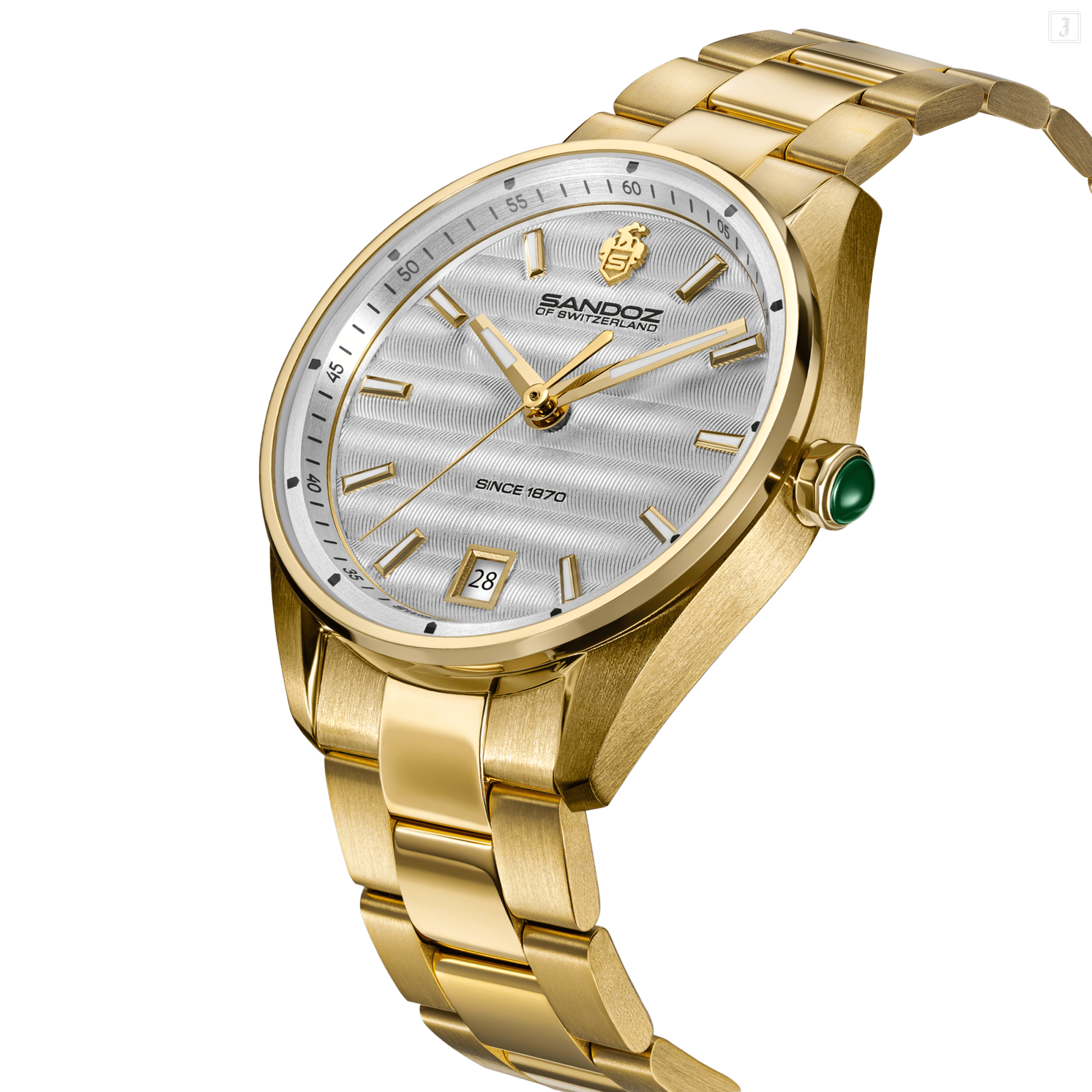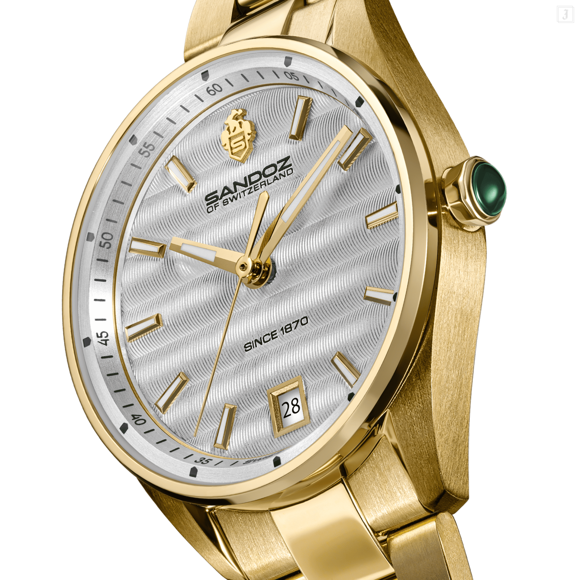 Combining presen-day practicality with the revered traditions of horology, Bachelin is at once contemporary and elegant. The silver dial, detailed with subtle Côtes de Genève striping, holds its own beneath a flat sapphire crystal. The yellow gold hands and markers know when to glow. A cabochon crown completes the look, refined and elegant. A date window nestles at six o’clock, mirroring the tone of the watch’s palette.