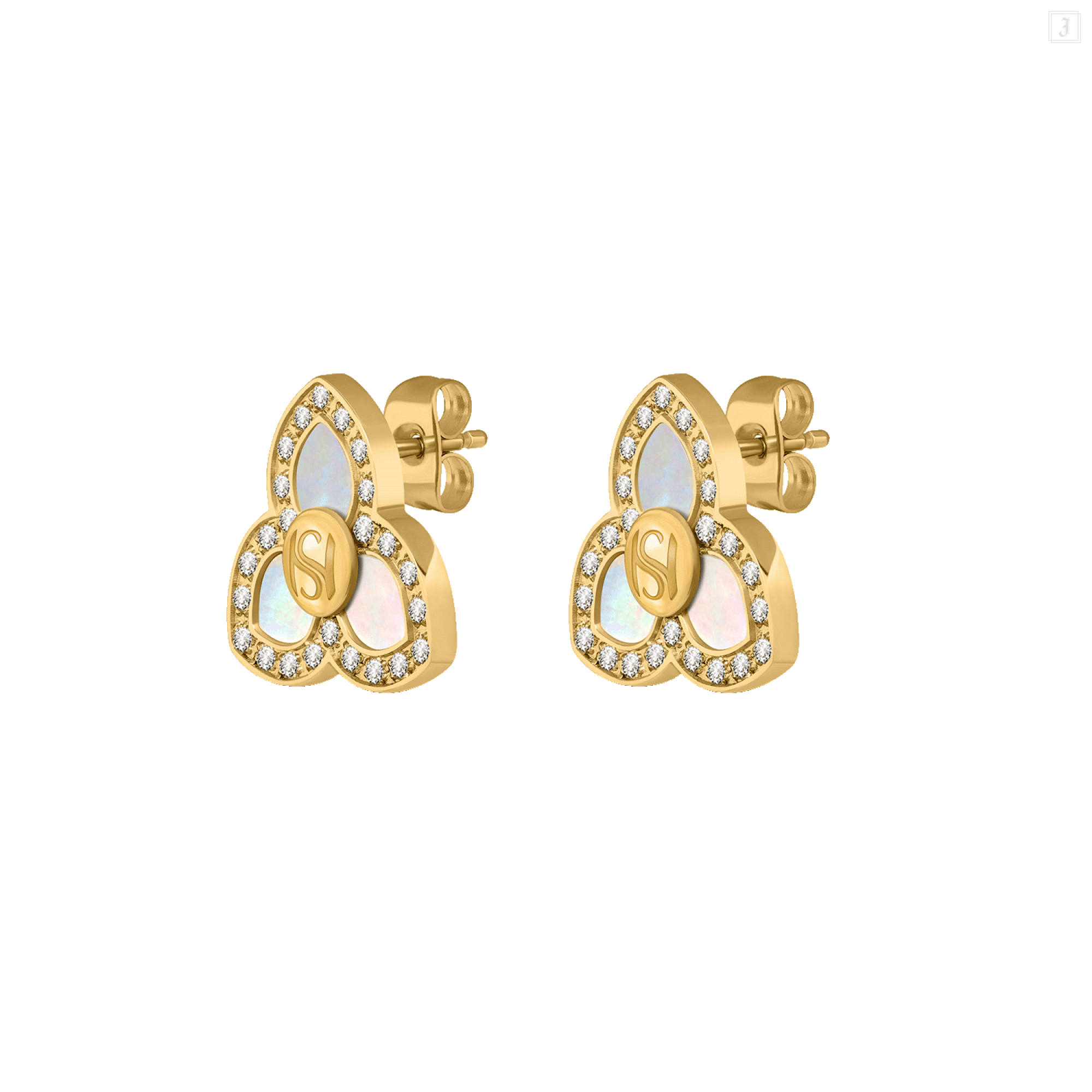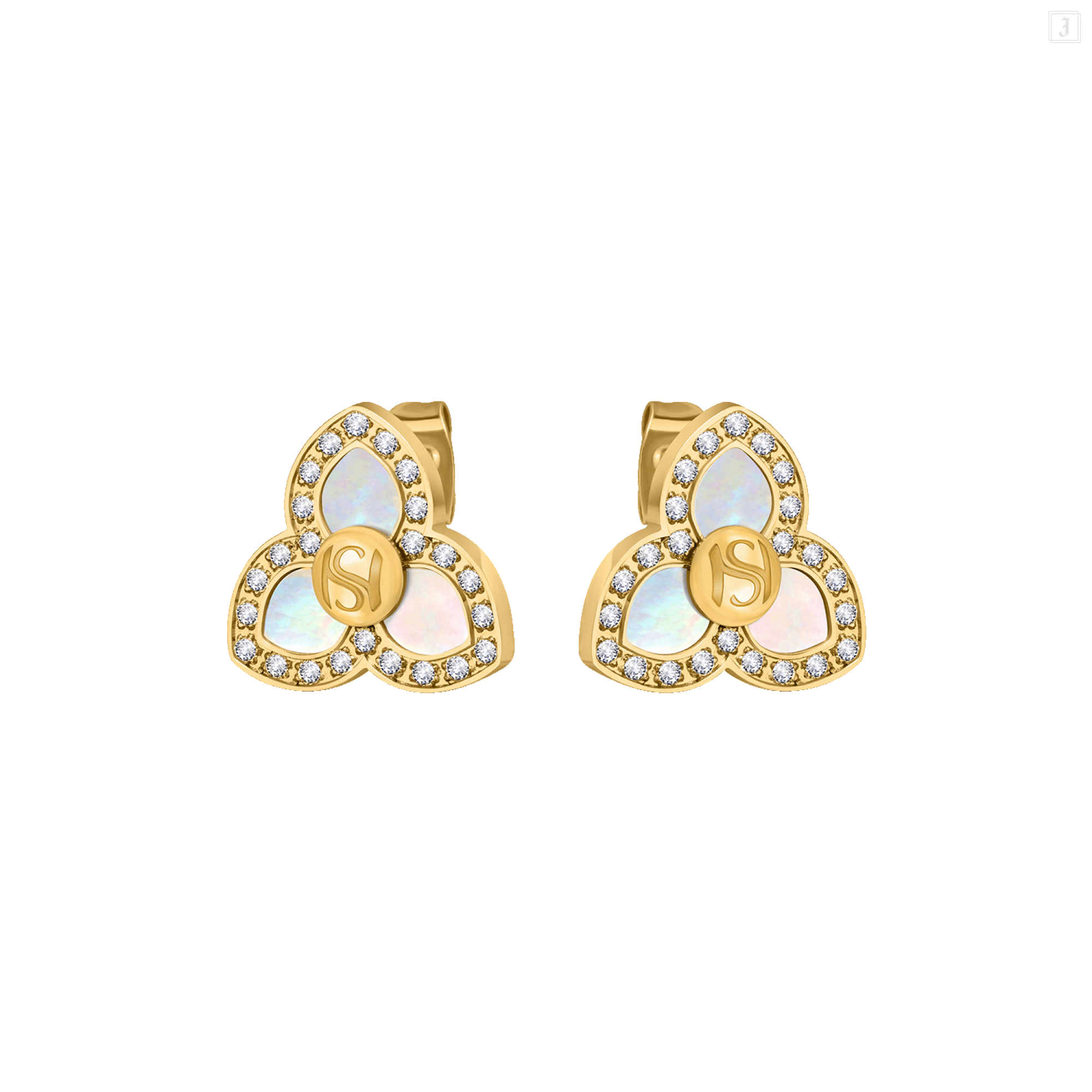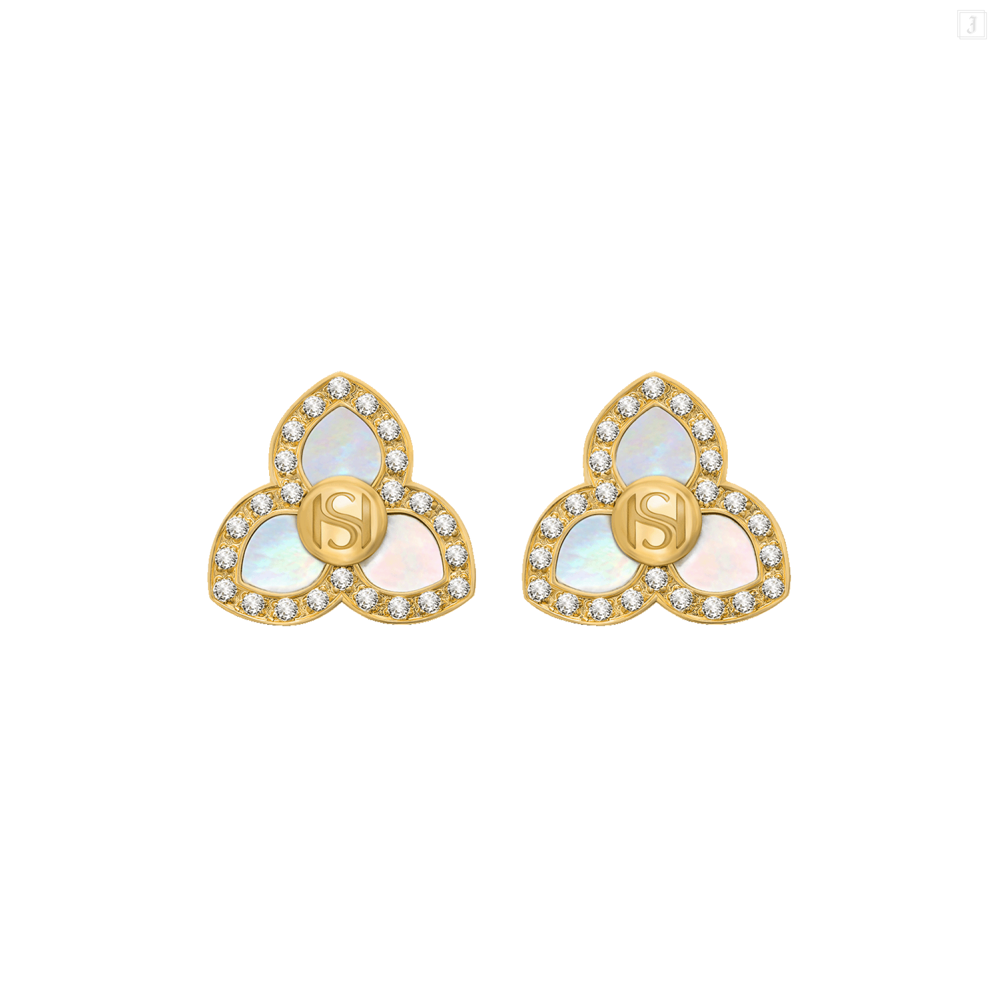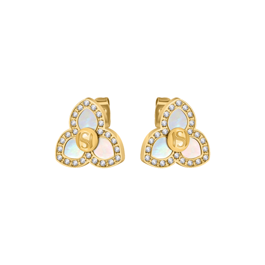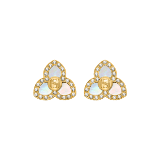 A captivating fusion of heritage and modernity, Burj earrings are a striking statement piece inspired by the soaring elegance of the world’s tallest tower. The three-petal mother of pearl studs echo the architectural silhouette with refined femininity. Crafted in radiant gold plating, the earrings add luminous depth and unmistakable presence to any look.