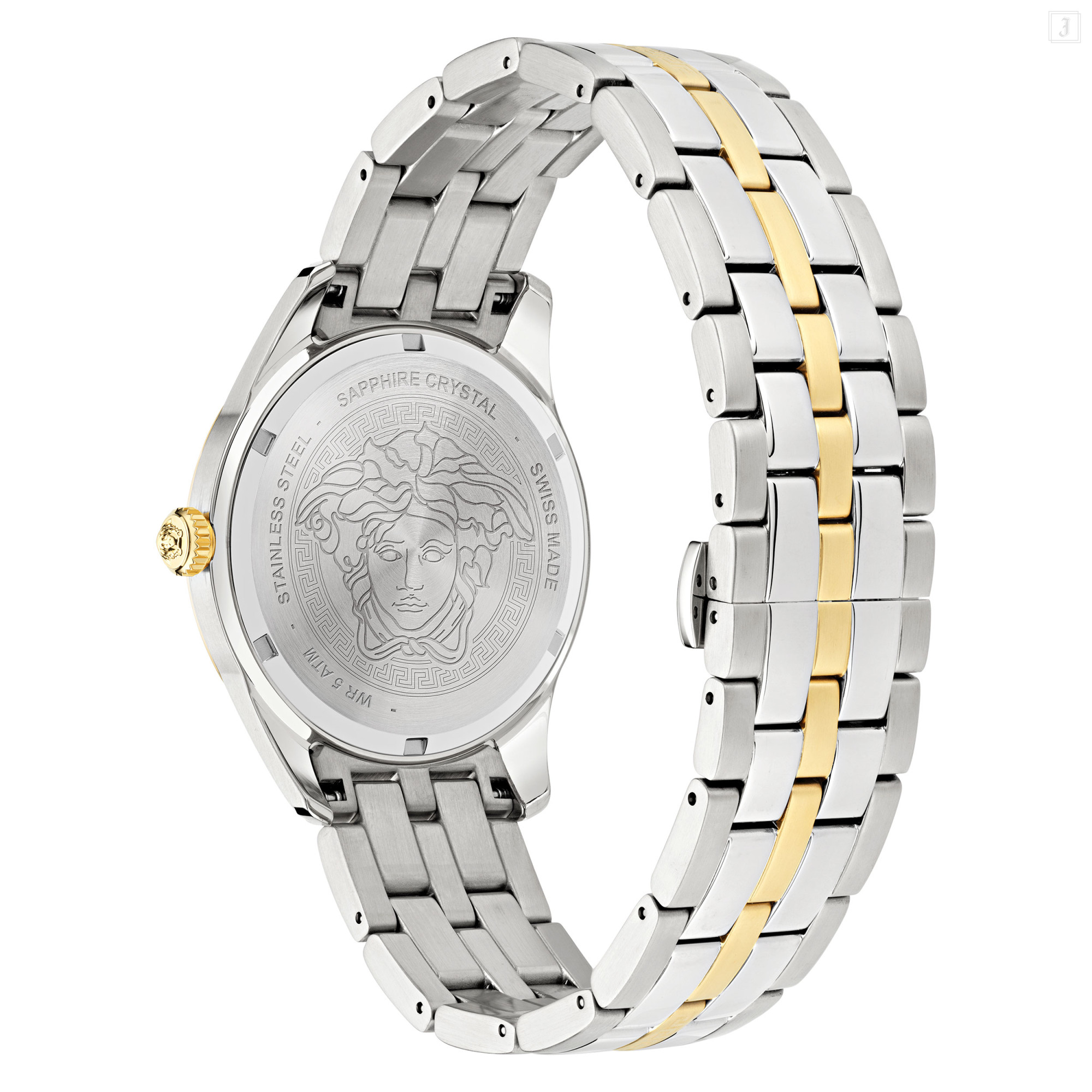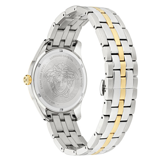 The modern timepiece is characterised by a tachymeter on the top ring. The dial features a tonal Greca pattern and a three-dimensional Medusa emblem at 12 o'clock. The model is updated with a GMT movement and has a window date with magnifying glass located at three o'clock. It's complete with a metal band strap. All Versace watches are guaranteed by the 'Swiss Made' marking. |