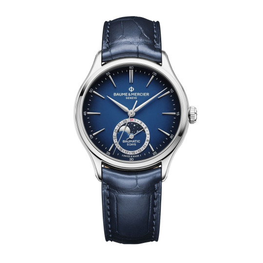 As a moon-phase and date timepiece, the Clifton Baumatic 10756 embodies the quintessence of refinement with its stainless steel case, gradient blue lacquered dial and rhodium-plated attributes. It comes with an interchangeable blue alligator strap adorned with tone-on-tone stitching. |