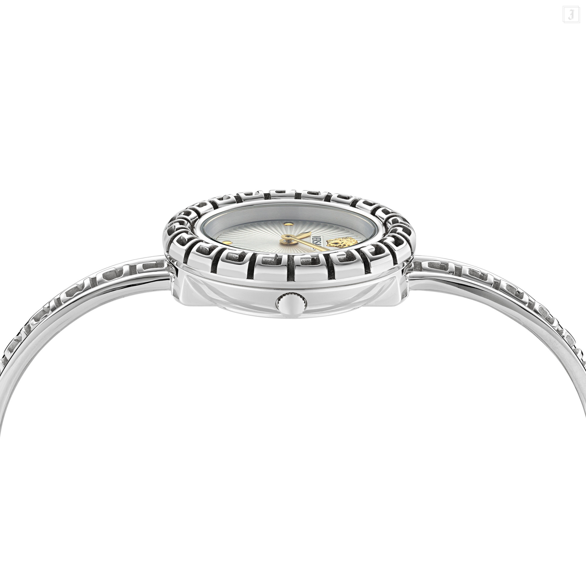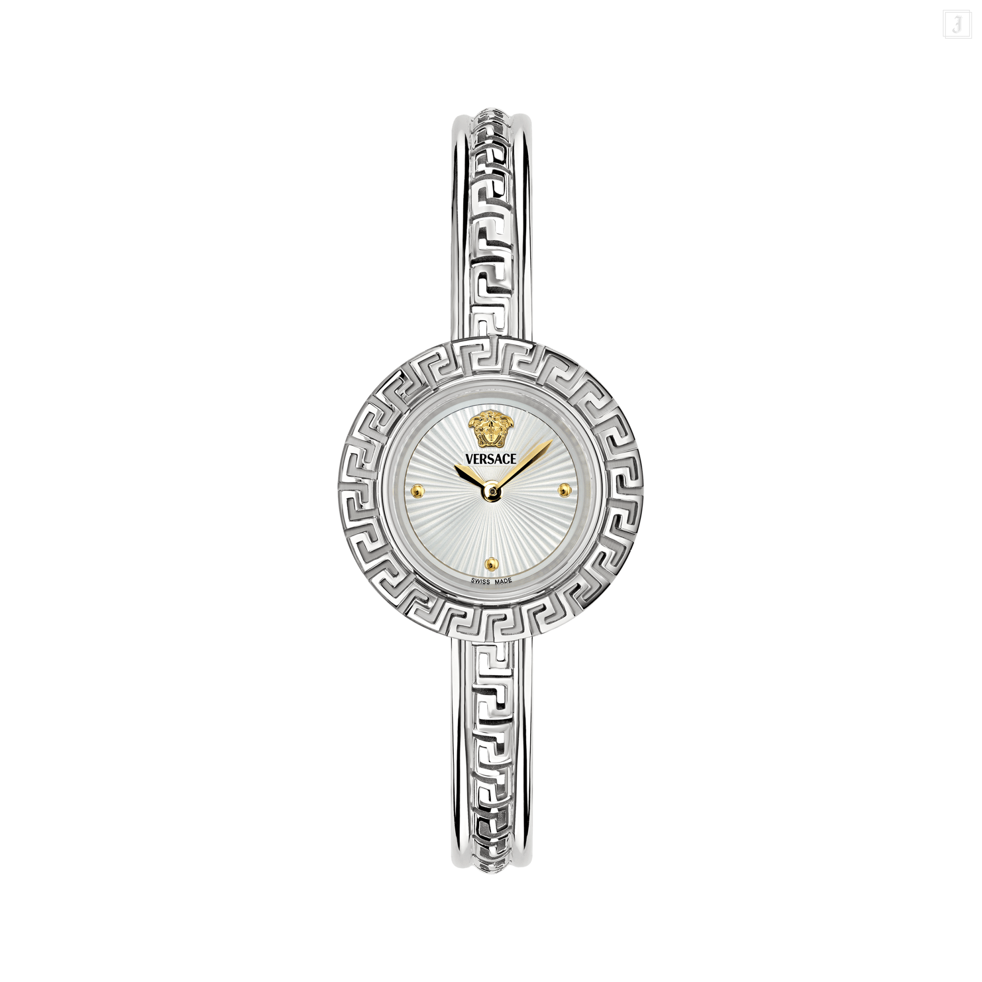 A unique, elegant jewelry timepiece with a tubular Greca motif enriching the case and bracelet. The case is detailed with a three-dimensional Medusa, Versace logo at 12 o'clock and 3 diamonds (0.08 ct) on indexes. All Versace watches are guaranteed by the 'Swiss Made' marking. |