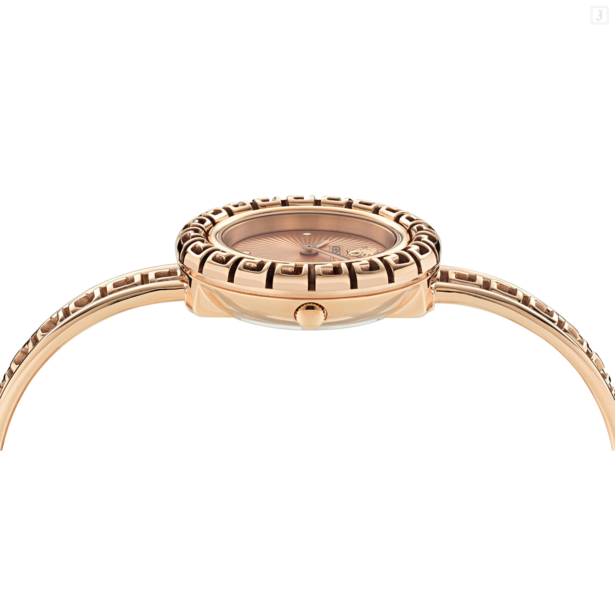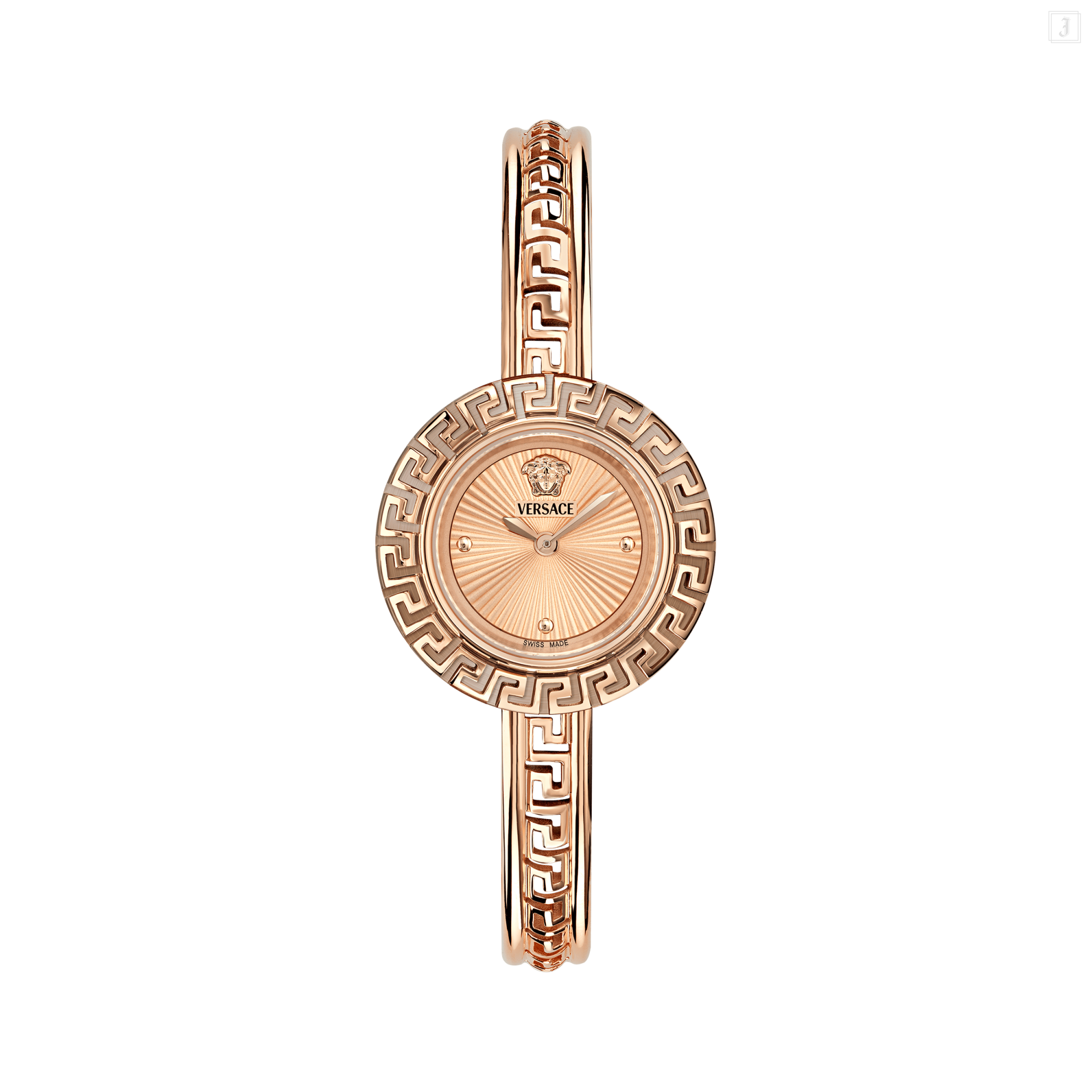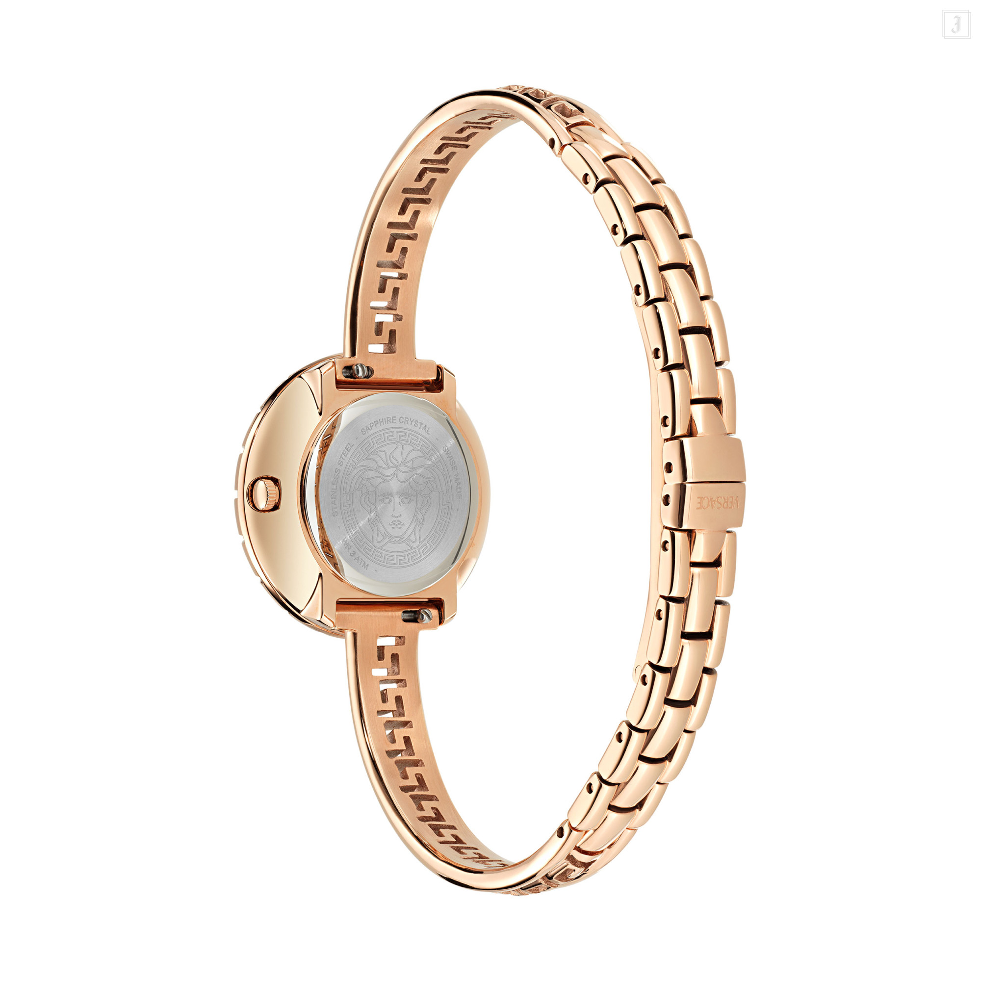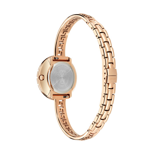 A unique, elegant jewelry timepiece with a tubular Greca motif enriching the case and bracelet. The case is detailed with a three-dimensional Medusa, Versace logo at 12 o'clock and 3 diamonds (0.08 ct) on indexes. All Versace watches are guaranteed by the 'Swiss Made' marking. |