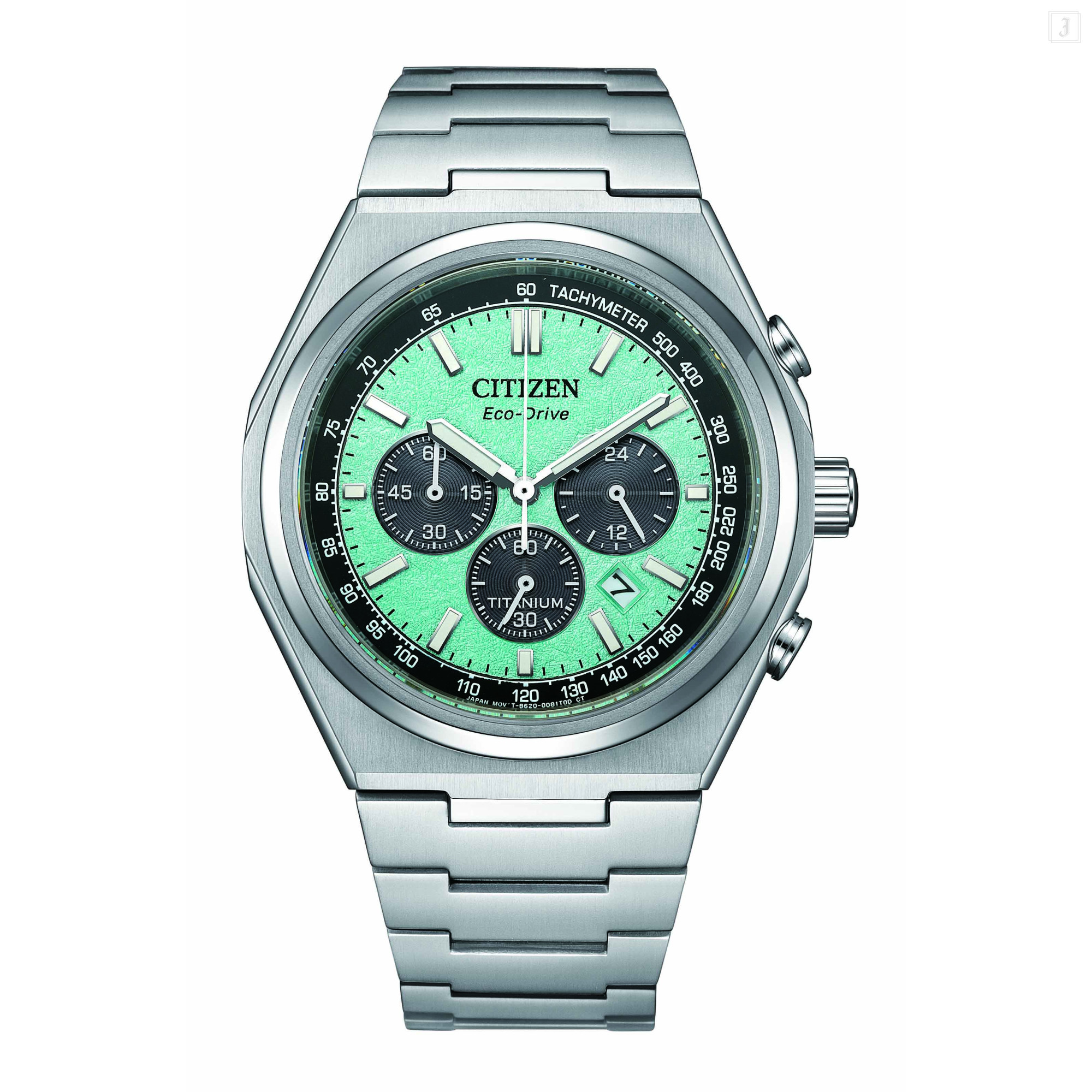 Pairing classic proportions with a distinctly modern style, meet the new Zenshin series from Citizen. Featuring a 42.4mm silver-tone Super Titaniumâ„¢ case paired with stylish stepped chronograph pushers and a stylized crown, the finely brushed and polished timepiece is secured to the wrist with a matching integrated bracelet. On the dial, a textured light blue color is accented with an outer tachymetric scale and triple register configuration in black, with details in silver-tone and white put to use for the handset and applied indices. Features include running time, a split-second chronograph, 12/24 hour time, and date. Sustainably powered by any light with Eco-Drive technology and never needs a battery. Water resistant to 100 meters. Caliber B620. |