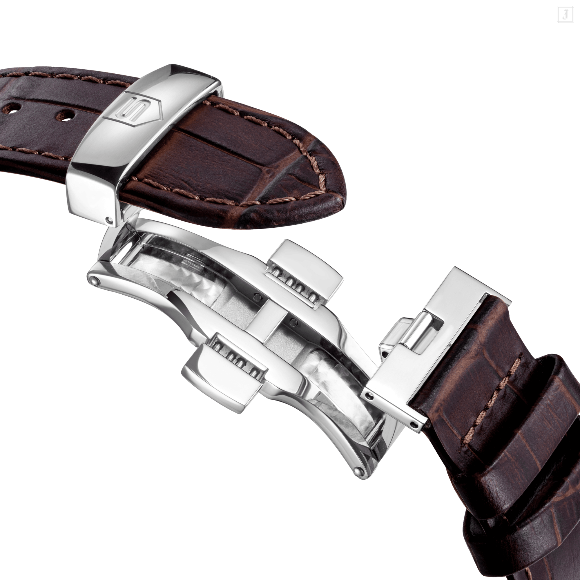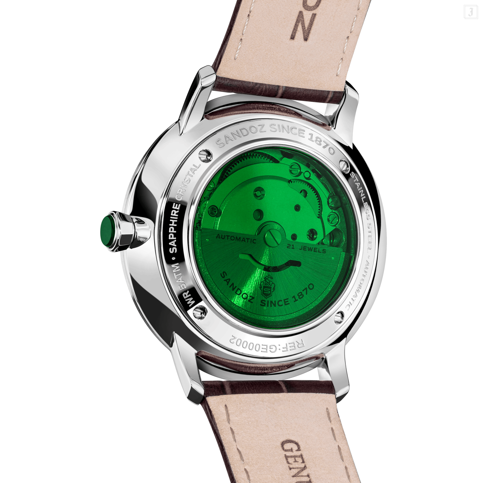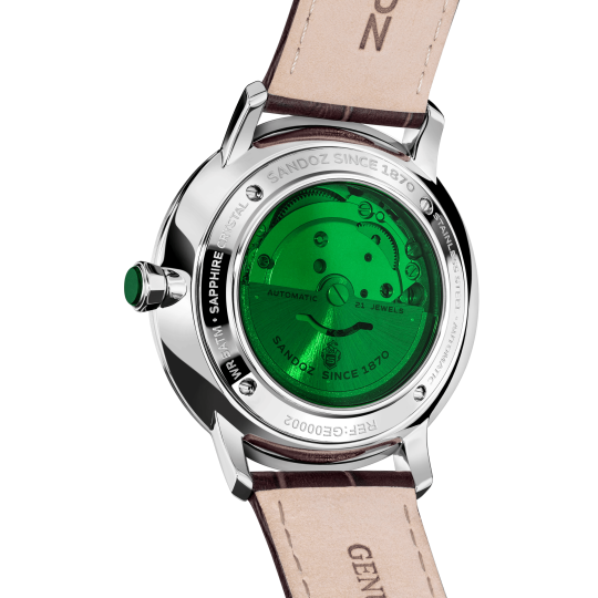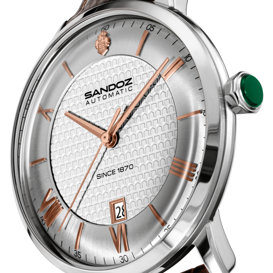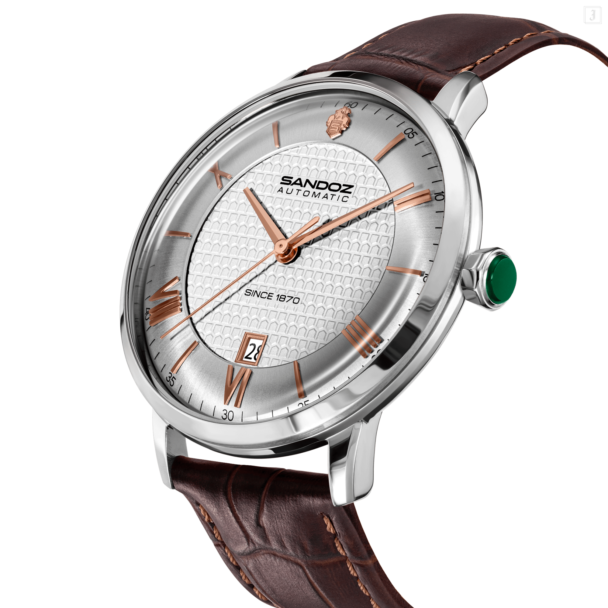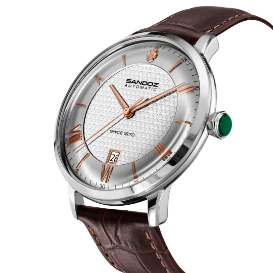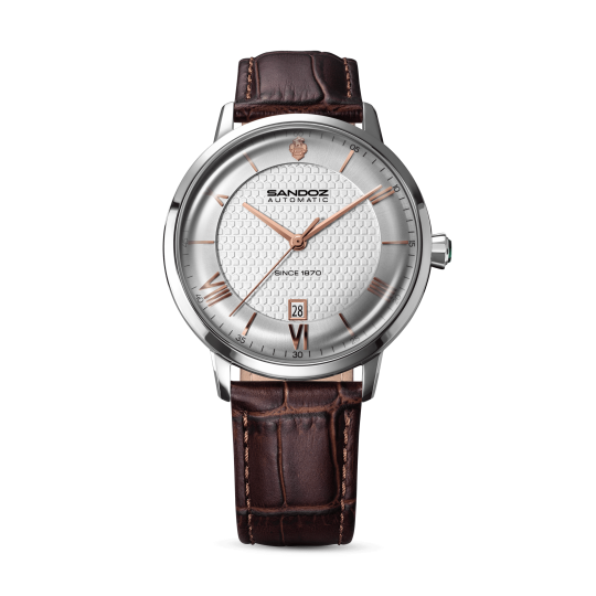 A classic silhouette, brought to life with contemporary finesse. Rochettes blends clean geometry with a warm, polished palette. The 41mm case wears clean and confident, with a dome sapphire crystal. Underneath, the silver dial keeps things refined. A closer look will reveal the inner dial textured with a repeating pattern pulled from the Sandoz crest - a subtle nod to heritage. The rose gold indexes and hands warm things up, while the Roman numerals give it just enough formality to keep it classic. Every glance reveals careful intention from the sweep of the automatic 3-hand movement with date, to the subtle taper of the brown leather strap.