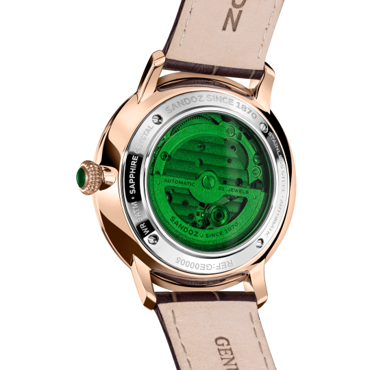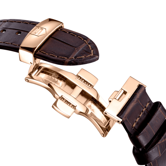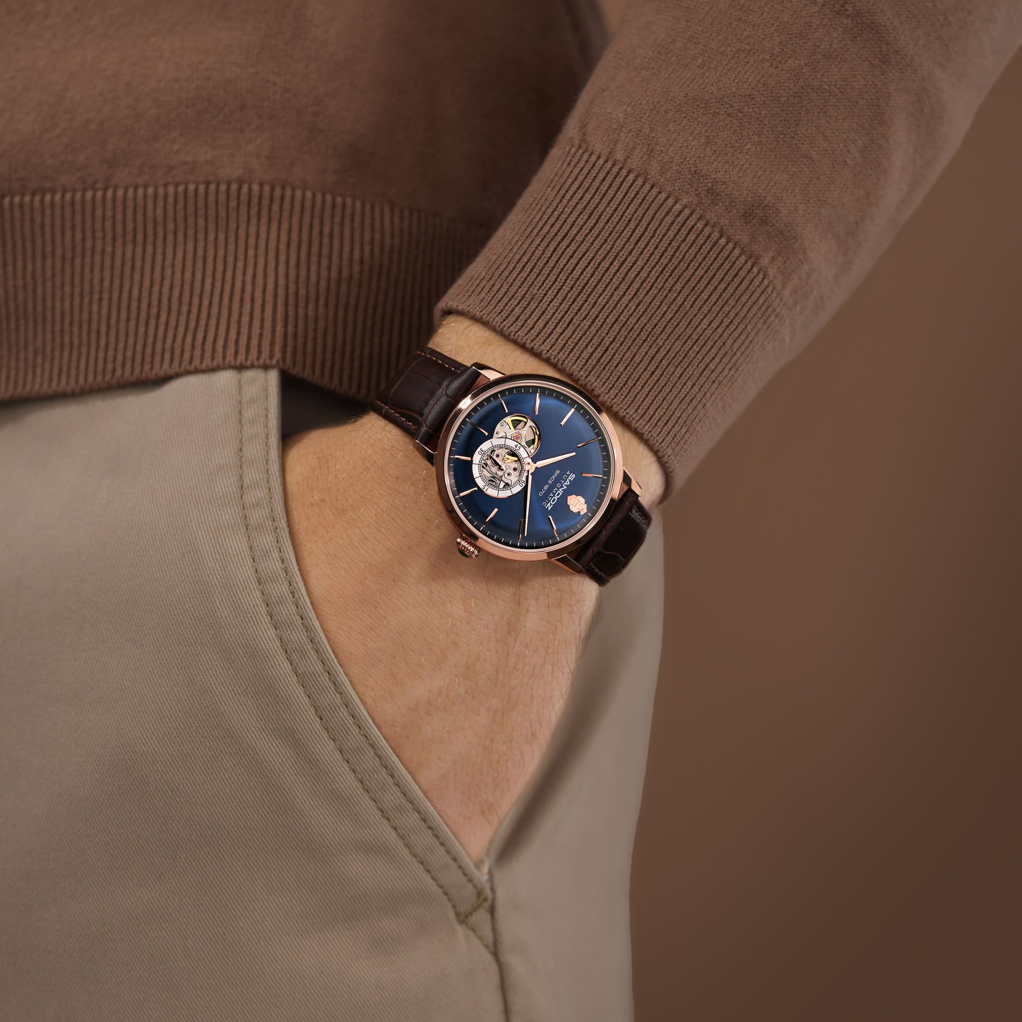 Imbued with a retro allure, Rochettes infuses a sense of rigorous discipline and timeless elegance in every detail. An air of refinement is conveyed through the open-heart dial showcasing meticulous craftsmanship and uninterrupted creativity. The blue bombe dial with contrast rose gold indexes and sleek hands creates a striking visual depth. This timepiece delivers quiet confidence, embracing a legacy of precision and style, all while being beautifully complemented by premium brown genuine leather. |