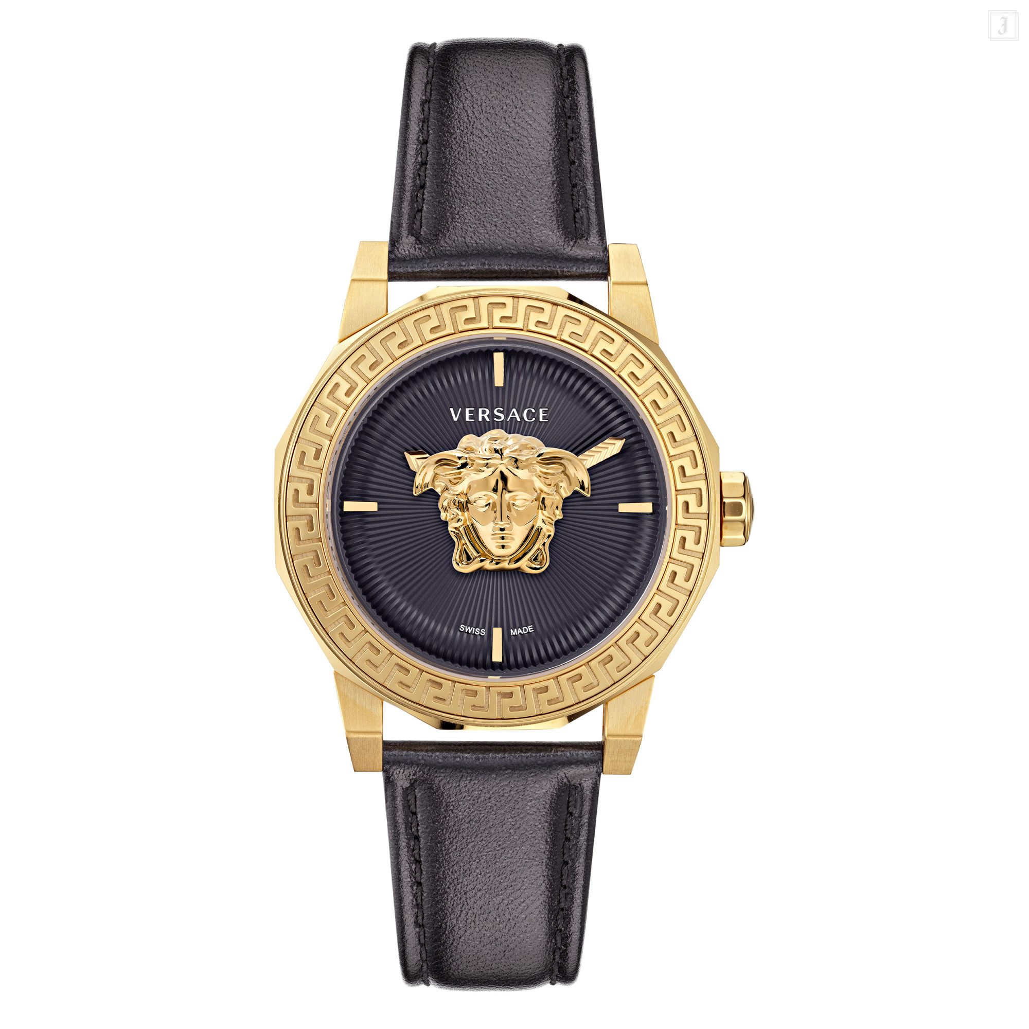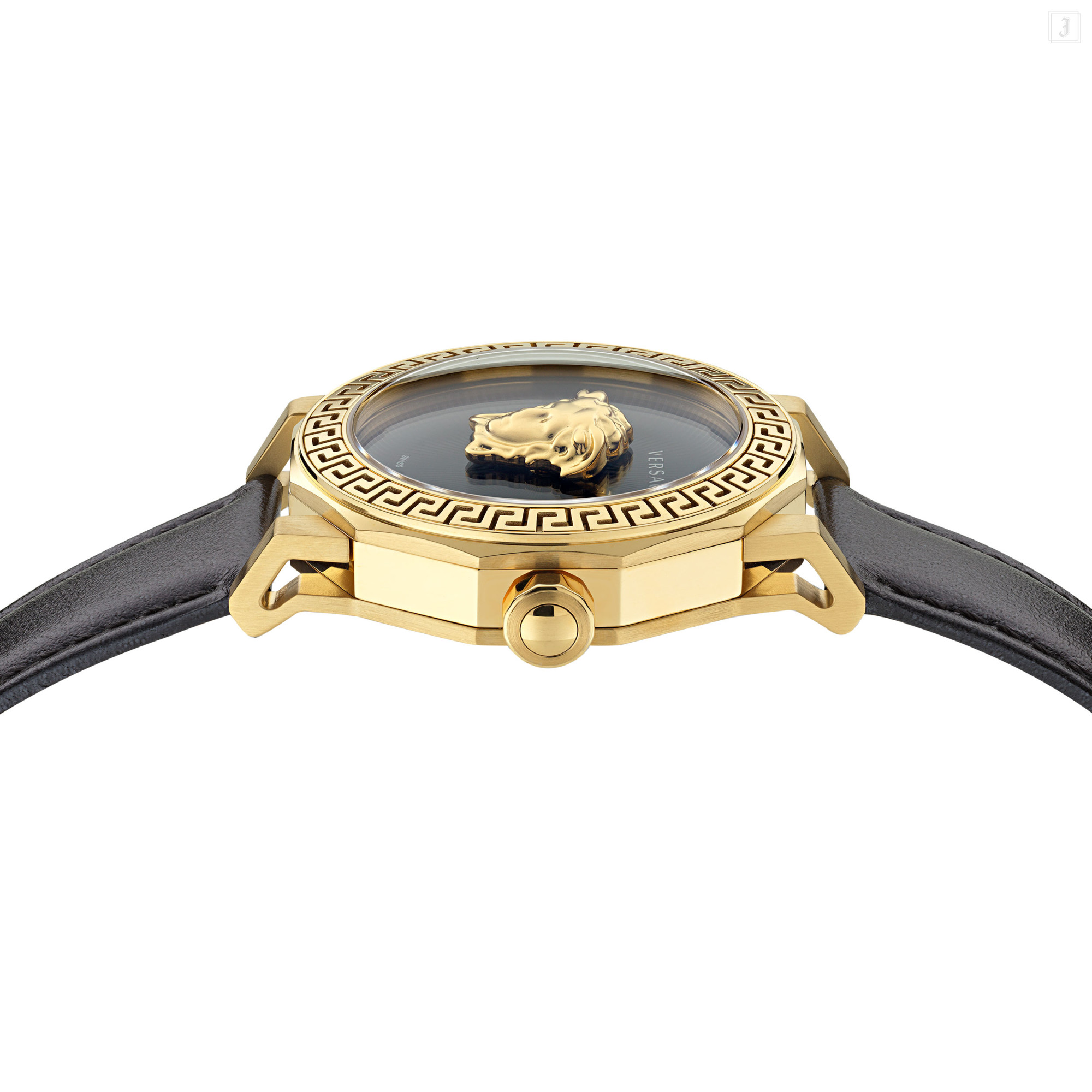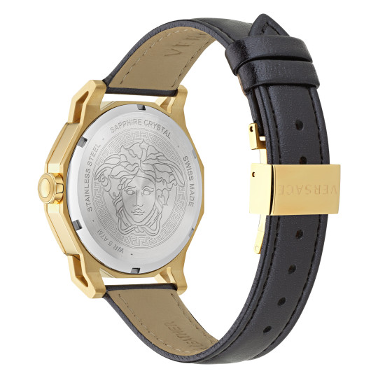 A Versace design with a three-dimensional floating Medusa on a guilloche dial. The top ring is detailed with a Greca pattern, and the timepiece is complete with a leather bracelet. All Versace watches are guaranteed by the 'Swiss Made' marking. All stainless steel is recycledK |